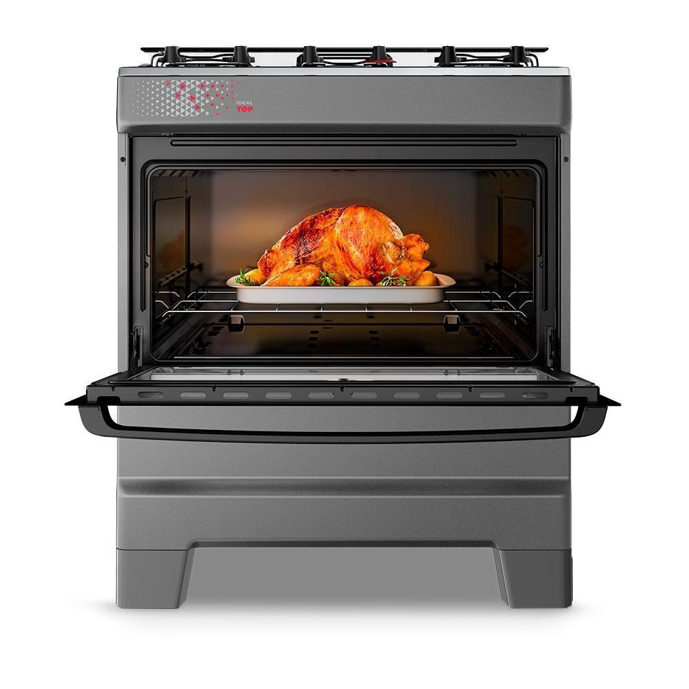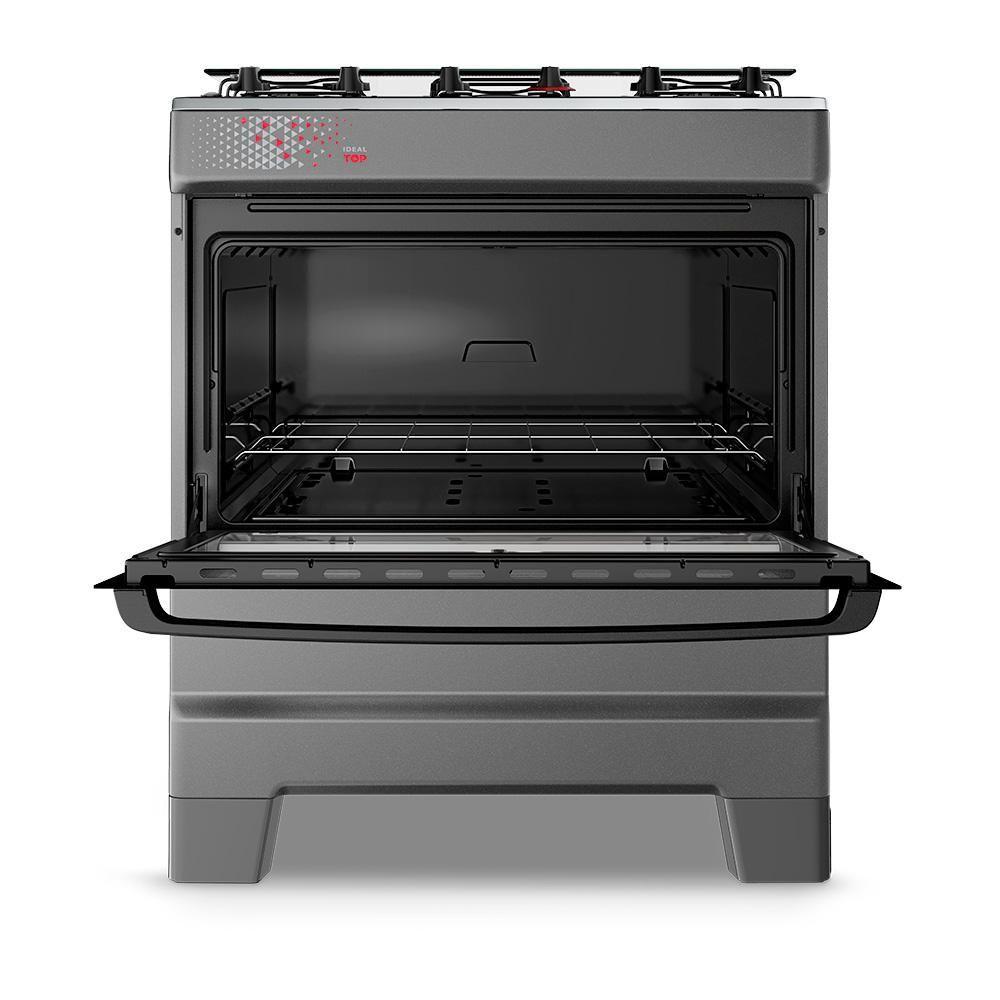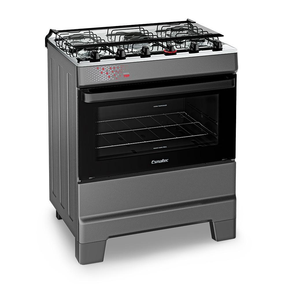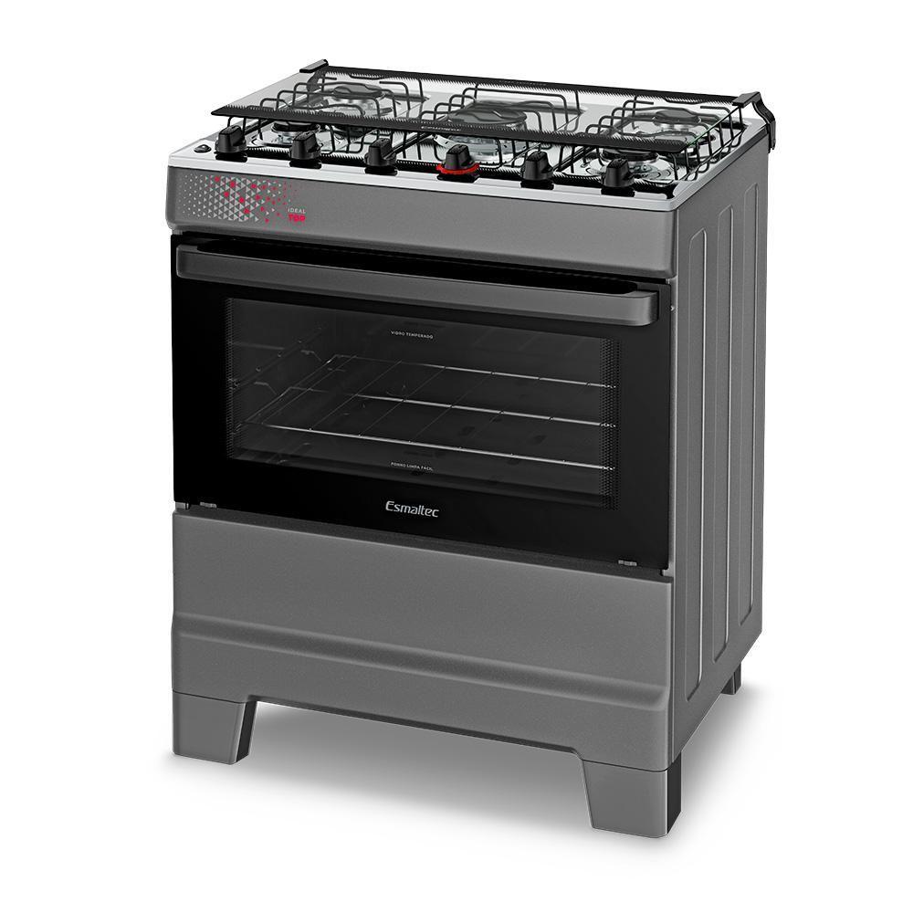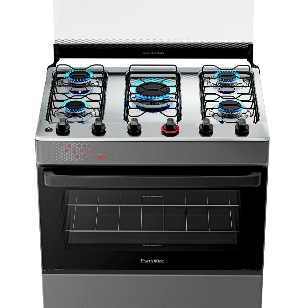 Fogão A Gás Mesa Inox Tampa De Vidro Forno 84L Esmaltec Ideal Top Titanium 5 Bocas BivoltAcendimento automático: mais agilidade no preparo.Mesa inox com tampão de vidro temperado: resistência e acabamento elegante. Trempes duplas com mais apoios: estabilidade reforçada para as panelas.Forno Limpa Fácil com 84 litros de capacidade: mais espaço para grandes receitas. Porta do forno em vidro total com vidro interno removível: praticidade na limpeza. Puxador e botões ergonômicos: conforto no uso e manutenção simplificada. Pés altos e retos com encaixe fácil: segurança e facilidade na movimentação.Acabamento Titanium: sofisticação e destaque para sua cozinha.O Fogão 5 Bocas Esmaltec Ideal Top a Gás com Mesa Inox Cor Titanium entrega robustez, sofisticação e funcionalidade em cada detalhe. Com mesa em aço inox e tampão de vidro temperado, o modelo une estética refinada com praticidade e proteção no uso diário.O acendimento automático traz mais agilidade na preparação das refeições. As trempes duplas com mais apoios garantem segurança e estabilidade para o uso de diferentes tamanhos de panela.O forno com 84 litros de capacidade oferece amplo espaço interno e conta com porta em vidro total, vidro interno removível e prateleira ajustável, facilitando o preparo de grandes receitas e a higienização após o uso.Além disso, o modelo possui puxador ergonômico, botões removíveis e pés altos e retos com encaixe fácil, garantindo conforto no manuseio, segurança e praticidade na rotina da cozinha.O Esmaltec Ideal Top 5 bocas Titanium a gás é a escolha ideal para quem busca um fogão imponente, funcional e com visual premium.Isso é valor.Isso é Esmaltec.Quantidade de Bocas: 5 | Produto: Fogão | Alimentação: A gás | Mesa: Aço Inox | Acendimento automático: Sim | Cor: TITANIUM | Voltagem: Bivolt | Tipo: De piso