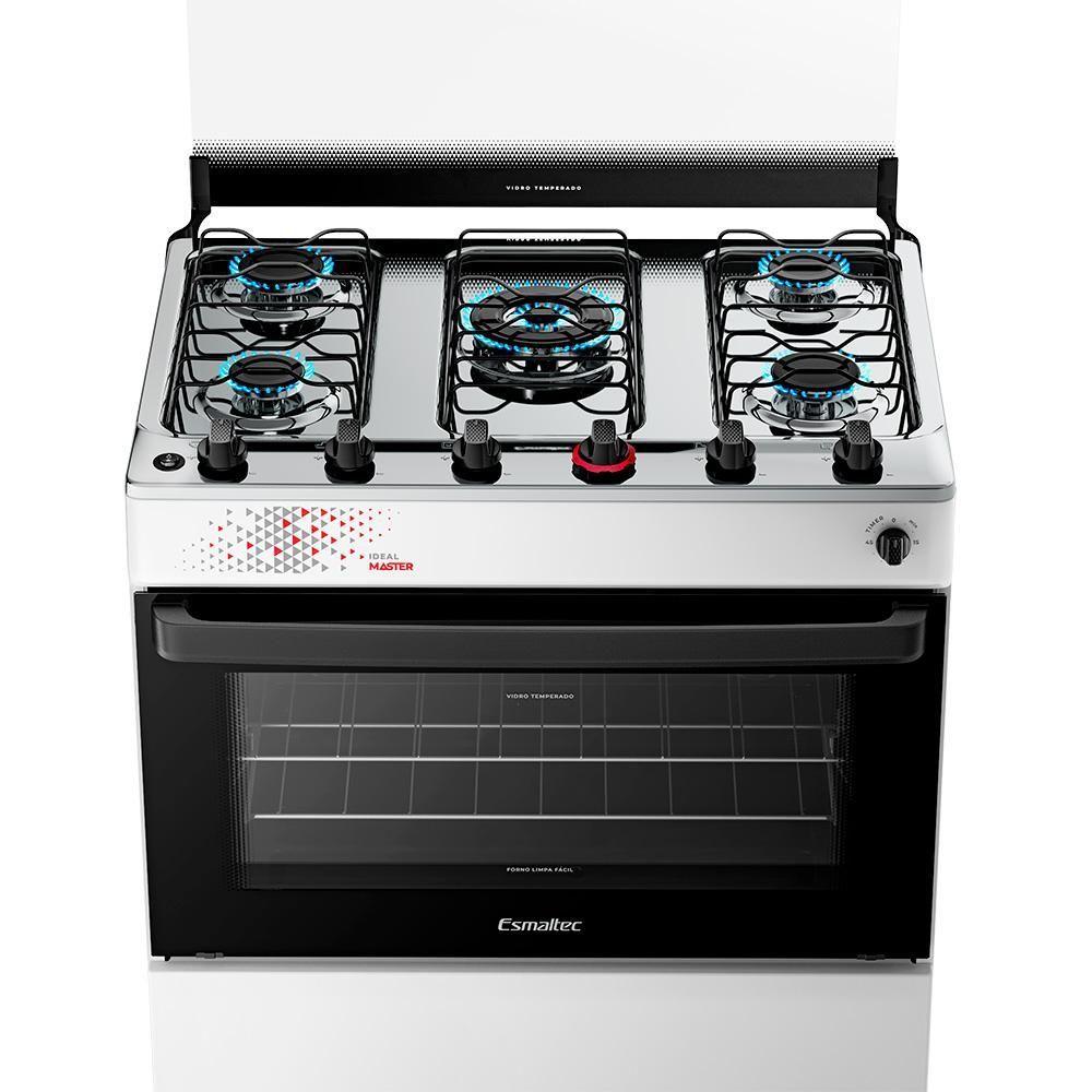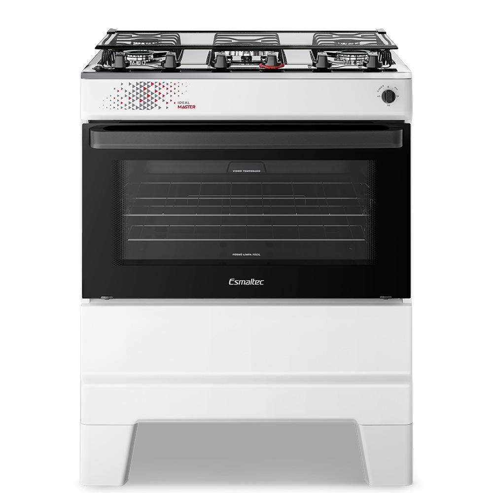 Fogão A Gás Mesa Inox Tampa De Vidro Forno 84L Esmaltec Ideal Master Branco 5 Bocas BivoltAcendimento automático: mais agilidade no uso.Mesa em aço inox: resistência e facilidade na limpeza.Tampão de vidro: estilo e praticidade para sua cozinha.Trempes duplas em aço esmaltado: estabilidade reforçada para as panelas.Timer mecânico: controle de tempo direto no painel.Forno Limpa Fácil com 84 litros de capacidade: mais espaço para grandes receitas.1 grade deslizante + 1 grade autodeslizante: mais praticidade e segurança no forno.Porta do forno em vidro total com vidro interno removível: limpeza e visual moderno.Pés altos e retos com encaixe fácil: estabilidade e limpeza facilitada.O Fogão 5 Bocas Esmaltec Ideal Master a Gás com Mesa Inox Branco é a escolha certa para quem precisa de mais espaço e desempenho na cozinha. A mesa em aço inox garante resistência ao uso diário e é fácil de limpar. Já o tampão de vidro agrega estilo, proteção e um acabamento mais elegante ao ambiente.Com acendimento automático, o uso é prático e seguro. Os queimadores bem distribuídos (3 família, 1 grande e 1 pequeno) oferecem flexibilidade para diferentes tipos de preparo, enquanto as trempes duplas em aço esmaltado garantem firmeza e durabilidade.O forno Limpa Fácil com 84 litros de capacidade acomoda receitas maiores e vem com porta em vidro total, vidro interno removível e duas grades (uma deslizante e uma autodeslizante), proporcionando mais praticidade e segurança no manuseio.O timer mecânico dá mais controle sobre o tempo de preparo, e os botões removíveis, puxador ergonômico e pés altos com encaixe fácil completam o conjunto com conforto, organização e funcionalidade.O Esmaltec Ideal Master 5 bocas branco a gás é ideal para quem valoriza um fogão espaçoso, confiável e com visual moderno.Isso é valor.Isso é Esmaltec.Quantidade de Bocas: 5 | Produto: Fogão | Alimentação: A gás | Mesa: Aço Inox | Acendimento automático: Sim | Voltagem: Bivolt | Tipo: De piso | Cor: Branco