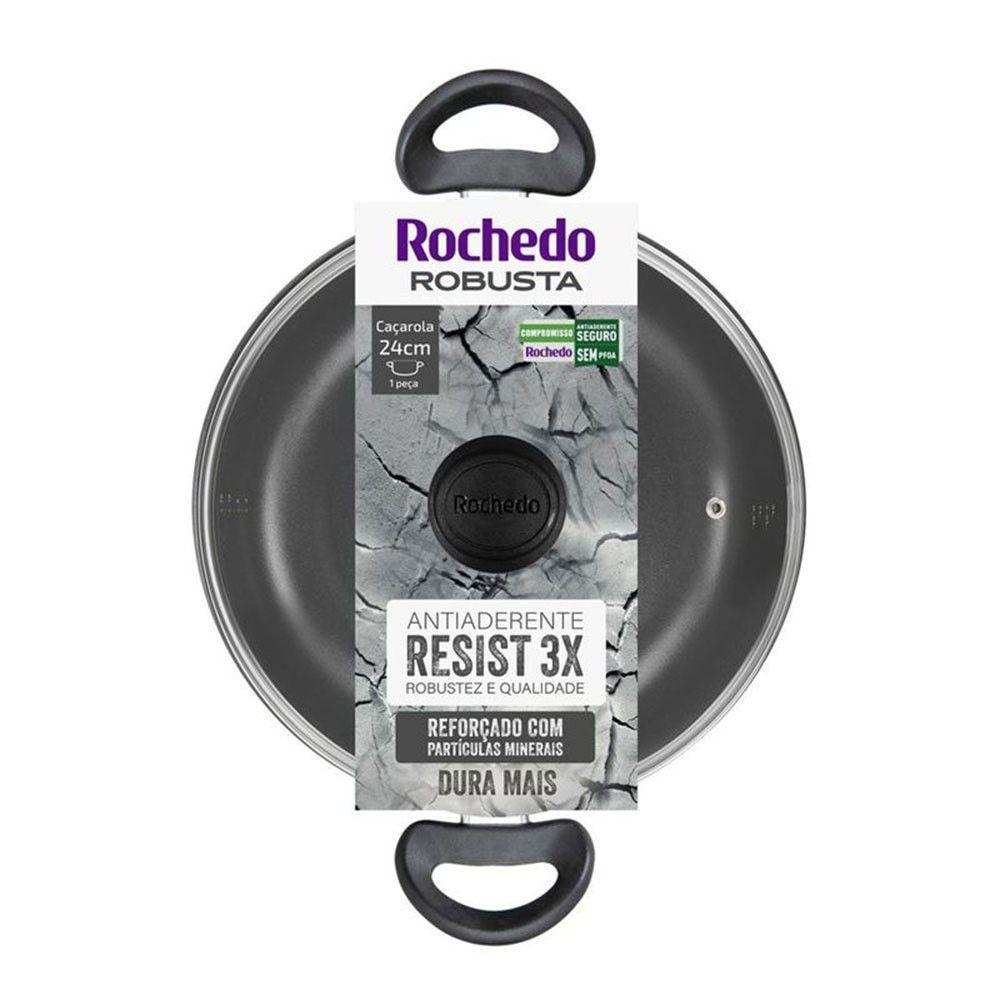 Caçarola Rochedo Robusta 24cm Grafite GrafiteLinha Rochedo Robusta, com antiaderente Resist 3x que oferece maior robustez e qualidade. Reforcado com particulas minerais, dura mais. A Cacarola Rochedo Robusta Grafite 24cm ira surpreender sua familia com sua durabilidade e resistencia. Conheca todos os diferenciais dessa linha: Antiaderente Resist 3X: Robustez e Qualidade. Reforcado com particulas minerais, dura mais. Durabilidade e resistencia: Alta espessura para durar mais Base Limpa Facil: Nao mancha, nao gruda e e facil de limpar. Marcas de Medidas: Para facilitar o preparo Alem de contar com a qualidade da marca Rochedo, presente no Brasil ha mais de 100 anos, a Cacarola Rochedo Robusta Grafite 24cm e livre de substancias toxicas (PFOA), garantindo a seguranca no uso do produto. Pode ir em todos os tipos de fogoes, exceto inducao, compativel com maquina de lavar loucas.Especificacao tecnica: Modelo: Robusta. Cor: Grafite. Tipo de material: Aluminio. Fontes de calor: Todos, exceto inducao. Conteudo da embalagem: 1 Cacarola 24cm.