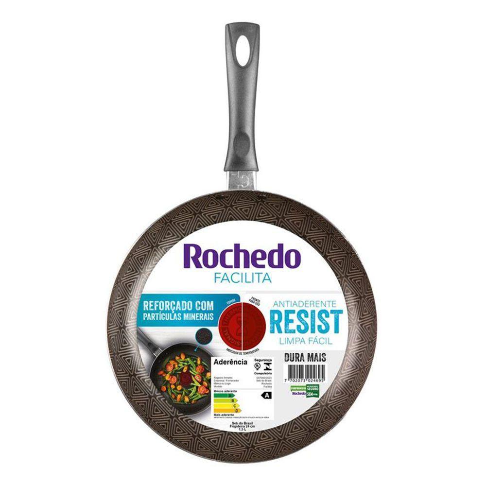 Frigideira Rochedo Facilita 24cm Vermelho VermelhoLinha Rochedo Facilita, com antiaderente Resist Limpa facil, reforcado com particulas minerais: Dura mais. Com a Frigideira Rochedo Facilita Vermelha 24cm, voce facilita seu dia a dia, com design moderno na cor vermelha, e o item ideal para sua cozinha. Conheca todos os diferenciais dessa linha: Antiaderente Resist: Limpa facil e dura mais, reforcado com particulas minerais. Thermo-Sinal: Muda de cor indicando o momento ideal para selar o seu alimento. Base Limpa Facil: Nao mancha, nao gruda e e facil de limpar. Cabos reforcados: mais seguranca e conforto. Alem de contar com a qualidade da marca Rochedo, presente no Brasil ha mais de 100 anos, a Frigideira Rochedo Facilita Vermelha 24cm e livre de substancias toxicas (PFOA), garantindo a seguranca no uso dos produtos. Pode ir em todos os tipos de fogoes, exceto inducao, compativel com maquina de lavar loucas.Especificacao tecnica:Modelo: Facilita.Cor: Vermelho.Tipo de material: Aluminio.Fontes de calor: Todos, exceto inducao.Conteudo da embalagem: 1 Frigideira 24cm.