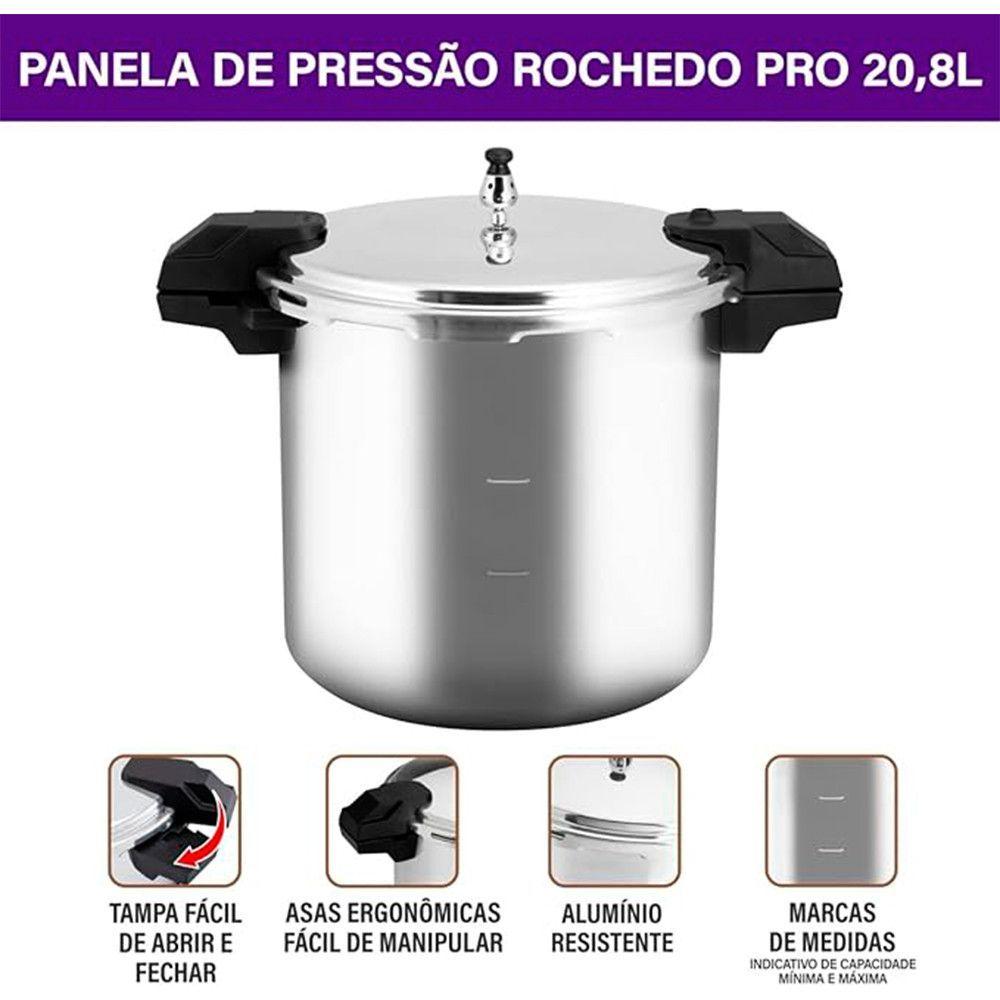 Panela De Pressão De Alta Capacidade Rochedo Pro 20l alumínio PolidoPanela de Pressao de Alta Capacidade Rochedo Pro 20LAlta Capacidade para Grandes Preparos: A Panela de Pressao Rochedo Pro 20L oferece capacidade ideal para receitas em grande quantidade. Com essa panela de pressao, os preparos em cozinhas profissionais se tornam mais eficientes, rapidos e organizados.5 Sistemas de Seguranca Integrados: Projetada para uso intensivo, conta com cinco sistemas de seguranca que garantem protecao maxima no preparo, fazendo dela uma panela robusta e confiavel para manuseio seguro em cozinhas profissionais.Manuseio Facil com Tampa e Asas Ergonomicas: Equipado com uma tampa facil de abrir e fechar e asas ergonomicas, esse modelo permite um manuseio seguro e pratico, oferecendo um design ideal para uso constante e intenso, garantindo eficiencia ao cozinhar.Durabilidade e Precisao: Produzida em aluminio resistente, conta com marcas de medidas internas que facilitam a precisao no preparo, alem de um acabamento que oferece alta durabilidade mesmo com uso frequente, proporcionando longevidade ao produto.Versatil e Livre de Toxicos: Compativel com fogoes a gas, vitroceramicos e eletricos (exceto inducao) e livre de substancias toxicas, essa panela combina praticidade e seguranca, com garantia de 10 anos para o corpo metalico e 2 anos para componentes.Caracteristicas:Marca: RochedoFabricante: #8206;Groupe SEBModelo: P3115233Registro no Inmetro INMETRO: 011986/2024Numero da peca: P3115233ASIN: #8206;B0DMFT6WQBTipo de fonte de energia: #8206;Nao aplicavelTipo de material: AluminioPode ser lavado na maquina de lavar louca, Compativel com fogao a gasPecas para montagem: 1 Panela De Pressao 20L + 01 manualDimensoes:Altura: 36,2cmLargura: 36,2cmProfundidade: 44,2cmPeso: 4,6kgGarantia do Fabricante: 24 Meses
