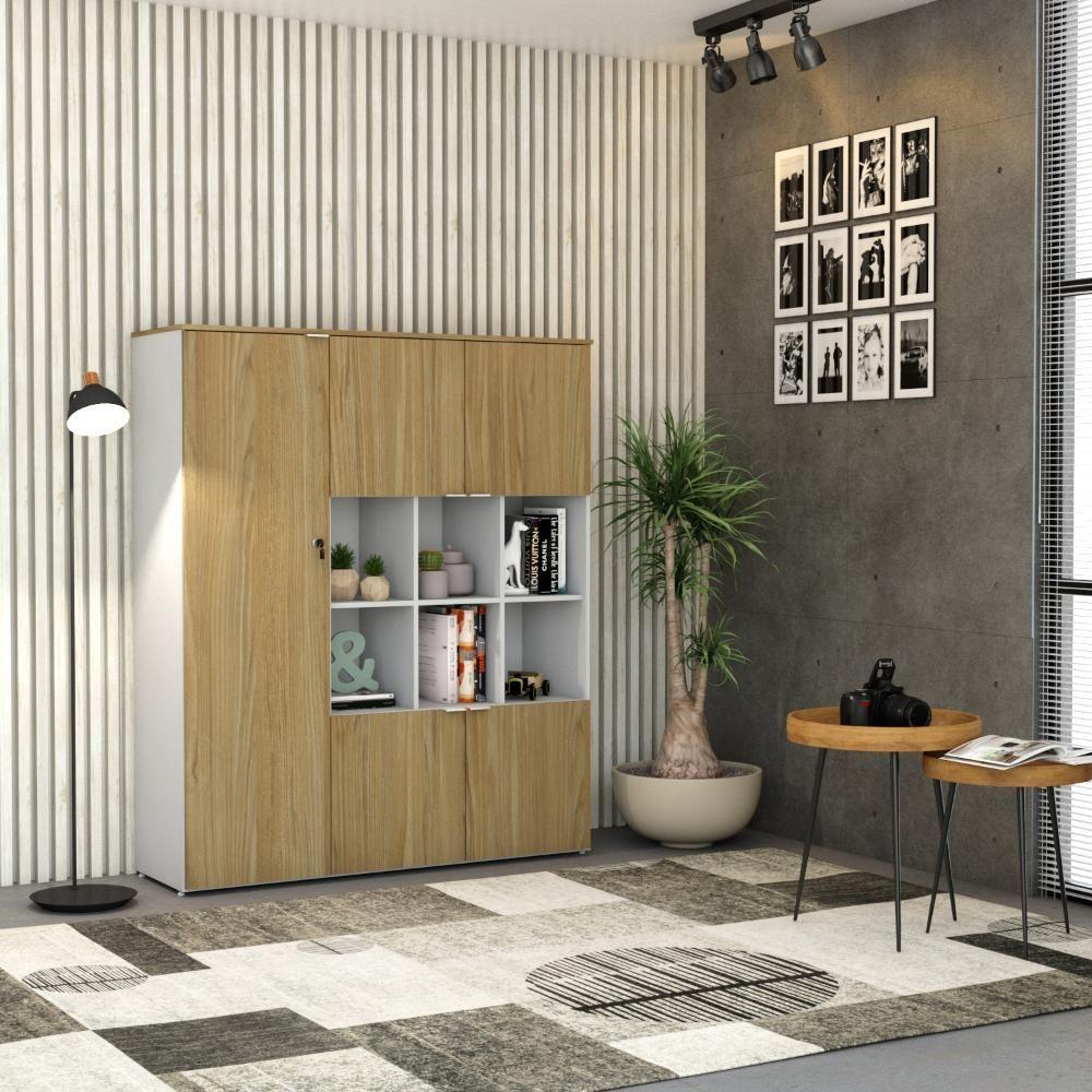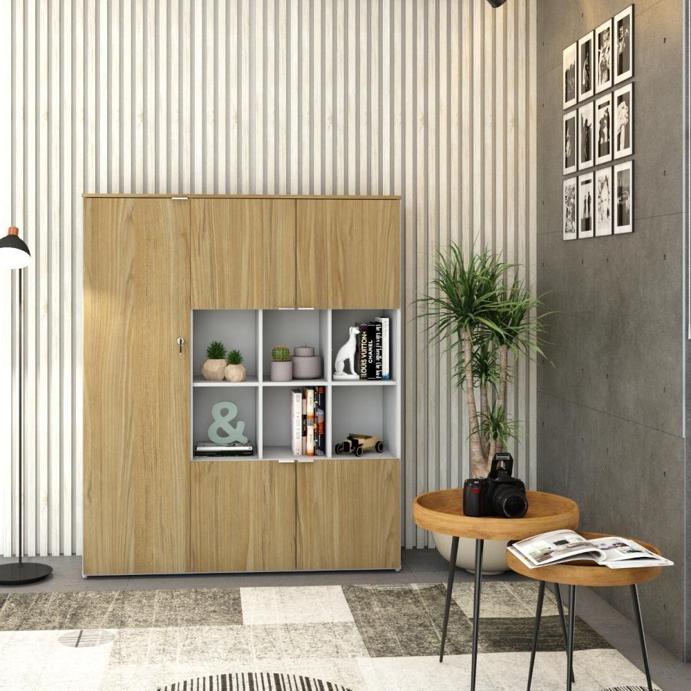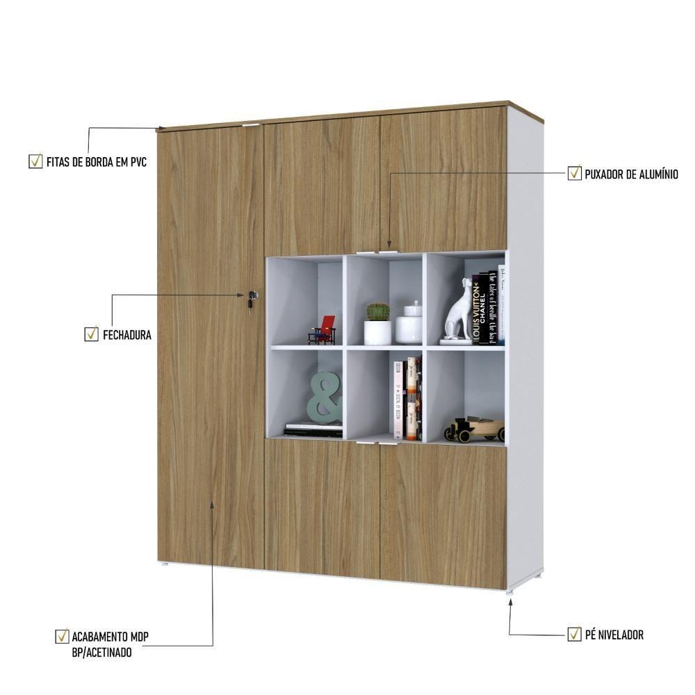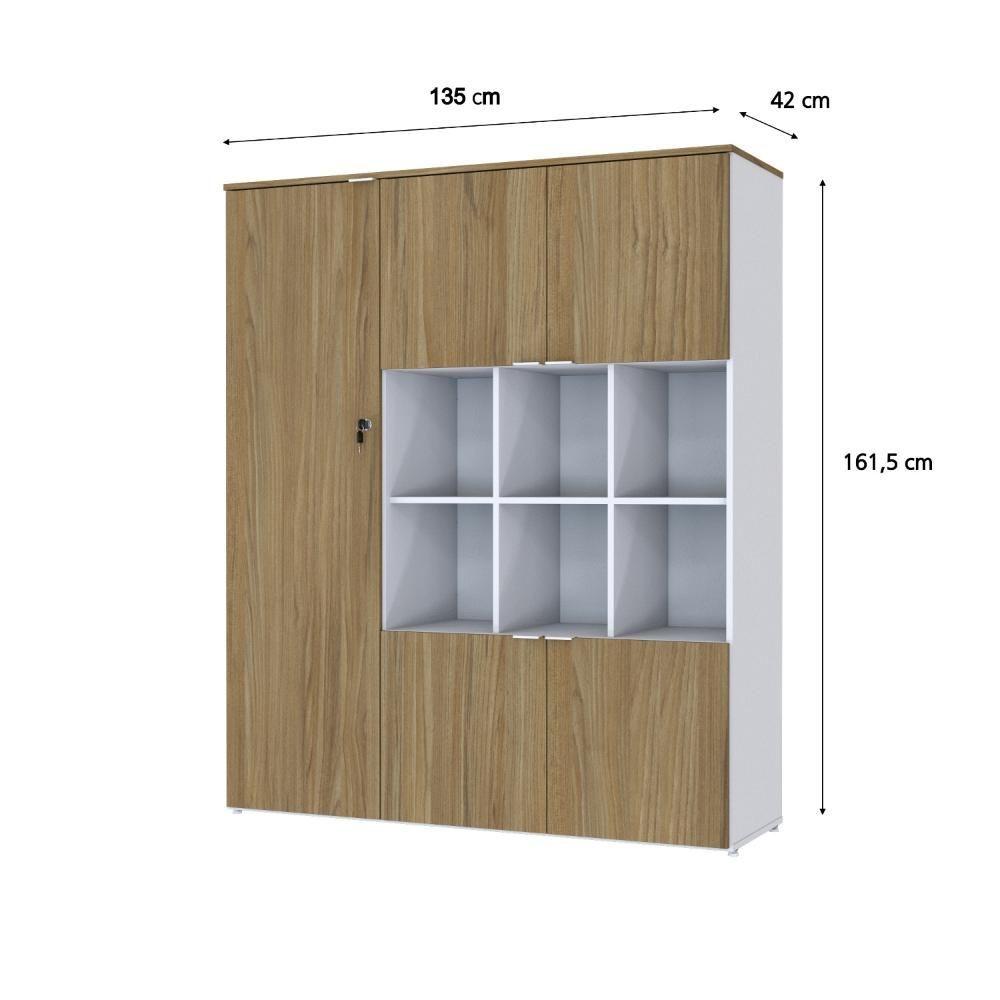 Armário Alto C/nichos E 05 Portas 161,5x135x42cm Wlan135 Branco Tx C/vermont Oak Branco Tx C/vermont OakSobre o ProdutoArmário Alto C/Nichos e 05 Portas 161,5x135x42cm WLAN135 Branco TX C/Vermont OakDescrição do Produto:Armário Alto com Nichos WLAN135 WorkLab é uma peça de mobiliário que alia capacidade de armazenamento com um design elegante e moderno, ideal para escritórios que valorizam tanto a funcionalidade quanto a estética. Com nichos centrais abertos e cinco portas, este armário oferece uma solução de armazenamento diversificada, perfeita para exibir itens decorativos ou manter materiais de consulta rápida à mão. Suas portas possuem dobradiças com amortecedor que garantem um fechamento suave e silencioso, além dos puxadores em alumínio, elegantes e funcionais. O Armário WLAN135 WorkLab é mais que um simples móvel de armazenamento, é uma declaração de estilo que traz organização e sofisticação ao ambiente de linha WorkLab combina funcionalidade, design contemporâneo e durabilidade para criar um ambiente de trabalho eficiente e inspirador. Com uma ampla variedade de peças versáteis, a WorkLab oferece soluções completas para escritórios, home offices e espaços corporativos. Explore os principais componentes dessa linha e ache a escolha certa para quem busca qualidade, design e funcionalidade em móveis de escritório. Transforme seu espaço de trabalho com a elegância e praticidade da linha Inclusos:1 Armário c/NichoDimensões dos Produtos:Armário Alto C/Nichos e 05 Portas 161,5x135x42cm WLAN135 Branco TX C/Vermont Oak: 135 x 42 x 161,5 cmInformações Logísticas (Comp. X Prof. X Alt.) 163 x 51 x 7,7 cm - Peso: 31,71 139 x 48 x 12,7 cm - Peso: 40,194 KgPeso Total: 71,904 KgObservações:Não acompanha acessórios decorativos. Imagens meramente ilustrativas.Informações Técnicas / Características:- Cor do Produto: Branco TX C/Vermont Oak- Cor do Predominante: Branco- Marca: Metalig- Modelo: WLAN135- Linha: WorkLab- Material: Mdp - Acabamento: BP- Escala de Brilho: Fosco- Fita de Borda: Pvc- Possui Portas: 5- Tipo de Porta: Bater- Tipo da Dobradiça: Metálica C/Amortecedor- Possui Gavetas: Não - Possui Chave: Sim - Material do Puxador: Alumínio- Possui Prateleiras: 5- Peso Máximo por Prateleira: 10kg - Pés Niveladores: Sim - Acabamento Estrutura: BP- Formato: Retangular- Possui Nicho: 6 - Suporta Até (kg): 90kg- Comprimento: 135cm- Profundidade: 42cm- Altura: 161,5cm - Peso Lí.: 70,29Kg- Recomendações de Uso, Manutenção e Limpeza: Para a limpeza, utilize flanela seca ou pano macio levemente umedecido em água. Utilize um pano seco em seguida. Evite com produtos químicos (solventes, thinner, acetona, etc) e não utilize nenhum tipo de esponja de aço.- Necessita de Montagem: Sim / Acompanha Manual de Montagem- Complexidade da Montagem: Alta: deve ser montado por um montador especializado.- Garantia: 6 meses Comprimento: 135 | Largura: 42 | Marca: Compace | Altura: 161,5 | Necessita montagem: Sim | Modelo: WLAN135 | Quantidade máxima de pedido: 1 | Quantidade de volumes: 2 | Profundidade: 42 Cor: Branco TX C/Vermont Oak