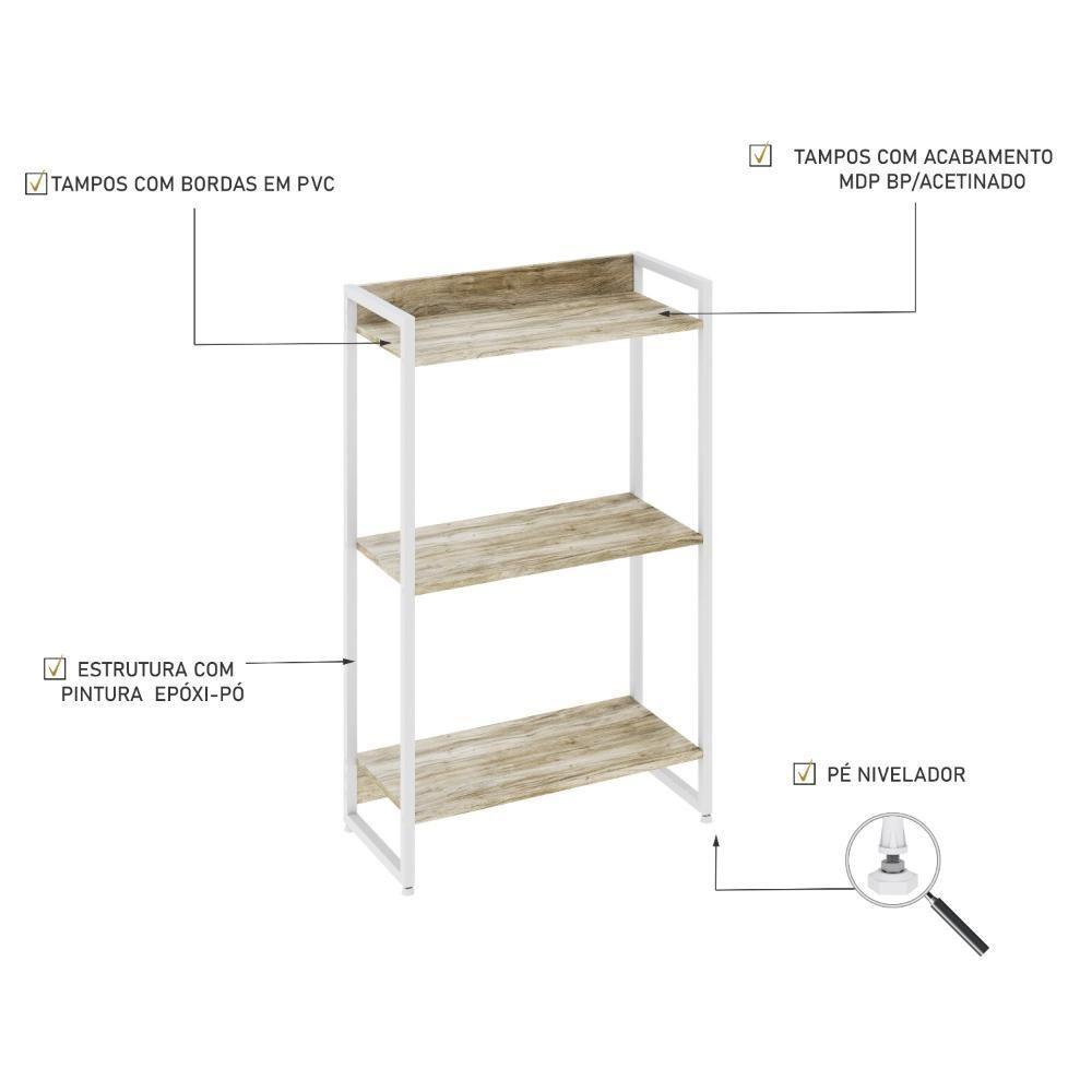 Estante Dynamica 60x30x104cm C/03 Prateleiras Carvalho / Carvalho / Sobre o ProdutoEstante Dynamica 60X30X104cm C/03 Prateleiras Carvalho / Est.BrancaDescrição do Produto:A Estante Dynamica DYES63 é um produto prático e versátil, que pode ser utilizado em diversos ambientes, como quarto e escritório, na sala, cozinha ou seu depó Linha Dynamica reúne design minimalista e praticidade, traços retos e móveis versáteis são as características dessa coleção. As estruturas metálicas possuem pintura Epóxi e sapatas niveladoras e, nos tampos, MDP BP Acetinado com fitas de borda em PVC. Itens Inclusos:1 EstanteDimensões dos Produtos:Estante Dynamica 60X30X104cm C/03 Prateleiras Carvalho / 60 x 30 x 104 cmInformações Logísticas (Comp. X Prof. X Alt.) 106 x 34 x 11 cm - Peso: 9,229 KgPeso Total: 9,229 KgObservações:Não acompanha acessórios decorativos. Imagens meramente ilustrativas.Informações Técnicas / Características:- Cor do Produto: Carvalho / - Marca: Compace- Modelo: DYES63- Linha: Dynamica- Material: Mdp- Material da Estrutura / Pés: Aço- Acabamento: BP Acetinado- Escala de Brilho: Fosco- Fita de Borda: Pvc- Possui Portas: Não - Possui Prateleiras: 3- Peso Máximo por Prateleira: 07 kg- Possui Pés: 2- Pés Niveladores: Sim - Acabamento Estrutura: Epóxi-Pó Texturizado - Suporta Até (kg): 21 kg- Comprimento: 60cm- Profundidade: 30cm- Altura: 104cm - Peso Lí.: 8,595Kg- Recomendações de Uso, Manutenção e Limpeza: Para a limpeza, utilize flanela seca ou pano macio levemente umedecido em água. Utilize um pano seco em seguida. Evite com produtos químicos (solventes, thinner, acetona, etc) e não utilize nenhum tipo de esponja de aço.- Necessita de Montagem: Sim / Acompanha Manual de Montagem- Complexidade da Montagem: Média: pode ser montado por mais de uma pessoa e/ou necessite de maior conhecimento para montagem.- Garantia: 6 meses Material: Mdp | Acabamento: BP Acetinado | Escala de Brilho: Fosco | Fita de Borda: Pvc | Material da Estrutura: Aço | Acabamento da Estrutura: Epóxi-Pó Texturizado | Produto: Estante | Cômodo indicado: Escritórios | Cor: Multicolorido | Tonalidade: Multicolorido | Quantidade de itens: 1 | Principais Características do Produto 0: Aço | do modelo: DYES63 | Certificação de teste externa: Não aplicável | Baterias são necessárias?: false | Palavras-chave de Pesquisa: Não Aplicável | Principais Características do Produto 1: MDP | da peça: DYES63 | de caixas: 1 | Principais Características do Produto 2: Pvc | Componentes incluídos: Manual de montagem e kit acessórios | Exige montagem: true | Fabricante: Compace | Peso do item: unit=kilograms;value=8.3800000000000008 | Dimensões do item P x L x A: depth#value=30;width#value=60;depth#unit=centimeters;width#unit=centimeters;height#value=104;height#unit=centimeters Cor: Carvalho /