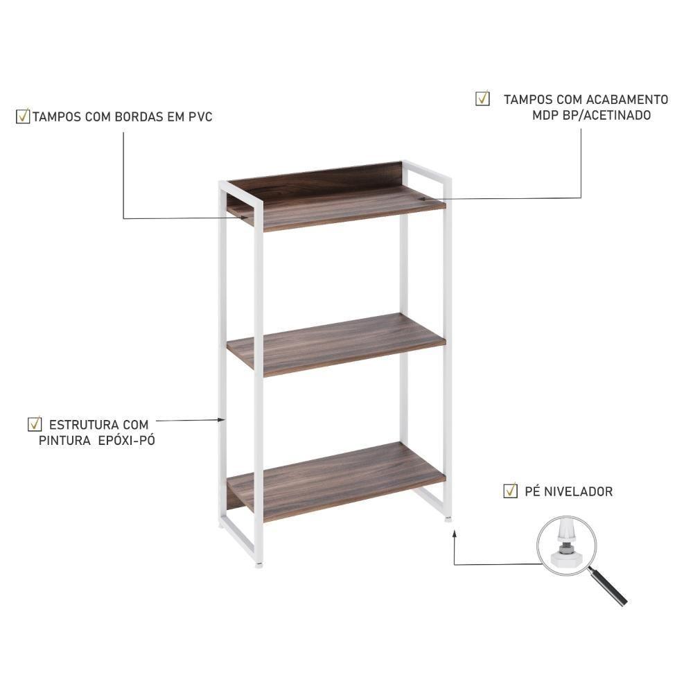 Estante Dynamica 60x30x104cm C/03 Prateleiras Nogal / Nogal / Sobre o ProdutoEstante Dynamica 60X30X104cm C/03 Prateleiras Carvalho / Est.BrancaDescrição do Produto:A Estante Dynamica DYES63 é um produto prático e versátil, que pode ser utilizado em diversos ambientes, como quarto e escritório, na sala, cozinha ou seu depó Linha Dynamica reúne design minimalista e praticidade, traços retos e móveis versáteis são as características dessa coleção. As estruturas metálicas possuem pintura Epóxi e sapatas niveladoras e, nos tampos, MDP BP Acetinado com fitas de borda em PVC. Itens Inclusos:1 EstanteDimensões dos Produtos:Estante Dynamica 60X30X104cm C/03 Prateleiras Carvalho / 60 x 30 x 104 cmInformações Logísticas (Comp. X Prof. X Alt.) 106 x 34 x 11 cm - Peso: 9,229 KgPeso Total: 9,229 KgObservações:Não acompanha acessórios decorativos. Imagens meramente ilustrativas.Informações Técnicas / Características:- Cor do Produto: Carvalho / - Marca: Compace- Modelo: DYES63- Linha: Dynamica- Material: Mdp- Material da Estrutura / Pés: Aço- Acabamento: BP Acetinado- Escala de Brilho: Fosco- Fita de Borda: Pvc- Possui Portas: Não - Possui Prateleiras: 3- Peso Máximo por Prateleira: 07 kg- Possui Pés: 2- Pés Niveladores: Sim - Acabamento Estrutura: Epóxi-Pó Texturizado - Suporta Até (kg): 21 kg- Comprimento: 60cm- Profundidade: 30cm- Altura: 104cm - Peso Lí.: 8,595Kg- Recomendações de Uso, Manutenção e Limpeza: Para a limpeza, utilize flanela seca ou pano macio levemente umedecido em água. Utilize um pano seco em seguida. Evite com produtos químicos (solventes, thinner, acetona, etc) e não utilize nenhum tipo de esponja de aço.- Necessita de Montagem: Sim / Acompanha Manual de Montagem- Complexidade da Montagem: Média: pode ser montado por mais de uma pessoa e/ou necessite de maior conhecimento para montagem.- Garantia: 6 meses Material: Mdp | Acabamento: BP Acetinado | Escala de Brilho: Fosco | Fita de Borda: Pvc | Material da Estrutura: Aço | Acabamento da Estrutura: Epóxi-Pó Texturizado | Produto: Estante | Cômodo indicado: Escritórios | Cor: Multicolorido | Tonalidade: Multicolorido | Quantidade de itens: 1 | Principais Características do Produto 0: Aço | do modelo: DYES63 | Certificação de teste externa: Não aplicável | Baterias são necessárias?: false | Palavras-chave de Pesquisa: Não Aplicável | Principais Características do Produto 1: MDP | da peça: DYES63 | de caixas: 1 | Principais Características do Produto 2: Pvc | Componentes incluídos: Manual de montagem e kit acessórios | Exige montagem: true | Fabricante: Compace | Peso do item: unit=kilograms;value=8.3800000000000008 | Dimensões do item P x L x A: depth#value=30;width#value=60;depth#unit=centimeters;width#unit=centimeters;height#value=104;height#unit=centimeters Cor: Nogal /