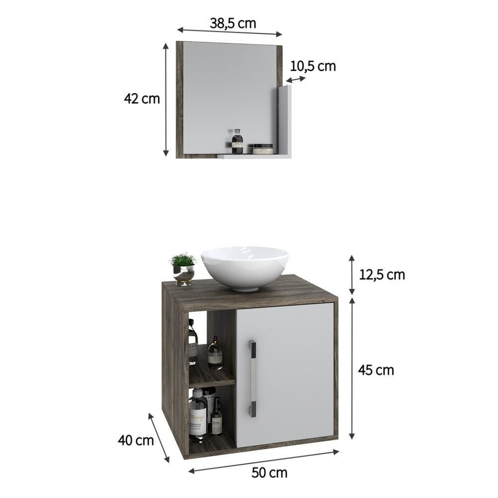 Conjunto Balcão C/cuba R30 E Espelheira Soft 500 Carvalho Dark Carvalho Dark C/branco ChessSobre o ProdutoConjunto Balcão C/Cuba R30 e Espelheira Soft 500 Branco ChessDescrição do Produto:O Conjunto Balcão C/Cuba e Espelheira Soft 500 KTSF500 tem design compacto, perfeito para pequenos espaços, conta com uma prateleira lateral e uma cuba de apoio, além da linha Basic traz móveis funcionais e de design tradicional, aliando simplicidade e estilo para seu ambiente de banheiro!Itens Inclusos:1 Conjunto Balcão C/Cuba e EspelheiraDimensões dos Produtos:Gabinete: 50 x 40 x 45 cmEspelheira: 40 x 10 x 42 cmCuba 30,5 x 30,5 x 12,5 cmInformações Logísticas (Comp. X Prof. X Alt.) 54 x 42 x 28 cm - Peso: 18,58 KgPeso Total: 18,58 KgObservações:Não acompanha acessórios decorativos. Imagens meramente ilustrativas.Informações Técnicas / Características:- Cor do Produto: Branco Chess- Cor do Predominante: Branco- Marca: Compace- Modelo: KTSF500- Linha: Basic- Material: Mdp - Acabamento: Perffect Acetinado- Escala de Brilho: Fosco- Fita de Borda: Pvc- Possui Portas: 1- Tipo de Porta: Bater- Tipo da Dobradiça: Metálica - Material do Puxador: Abs- Possui Prateleiras: 2- Peso Máximo por Prateleira: 1 kg Espelheira / 3 kg Balcão- Possui Pés: Não, suspenso - Possui Espelho: Sim- Possui Vidro: Sim- Acompanha Cuba / Lavatório: Sim, de Mármore Sintético- Furação para Cuba / Lavatório: Não- Tipo da Cuba: Apoio- Cor da Cuba: Branca- Suporta Até (kg): 16 kg - Peso Lí.: 17,35Kg- Recomendações de Uso, Manutenção e Limpeza: Para a limpeza, utilize flanela seca ou pano macio levemente umedecido em água. Utilize um pano seco em seguida. Evite com produtos químicos (solventes, thinner, acetona, etc) e não utilize nenhum tipo de esponja de aço.- Necessita de Montagem: Sim / Acompanha Manual de Montagem- Complexidade da Montagem: Média: pode ser montado por mais de uma pessoa e/ou necessite de maior conhecimento para montagem.- Garantia: 6 meses Material: Mdp | Acabamento: Perffect Acetinado | Escala de Brilho: Fosco | Fita de Borda: Pvc | Possui Portas: 1 | Tipo de Porta: Bater | Tipo da Dobradiça: Metálica | Limite de unidades por venda: É possível comprar até 1 unidade por venda. | Tipo de produto: Gabinete de banheiro | Quantidade máxima de pedido: 1 | Fabricante: Compace | Comprimento: 50 | Largura: 40 | Altura: 45 | Profundidade: 45 | Preço trabelado: | Componentes incluídos: | Principais Características do Produto 0: | Baterias são necessárias?: | Principais Características do Produto 2: | Cor: | Principais Características do Produto 1: | Certificação de teste externa: | Palavras-chave de Pesquisa: | Is Fragile: | Dimensões do item P x L x A: | Exige montagem: | da peça: | Peso do item: | do modelo: | Quantidade de itens: | de caixas: Cor: Carvalho Dark C/Branco Chess