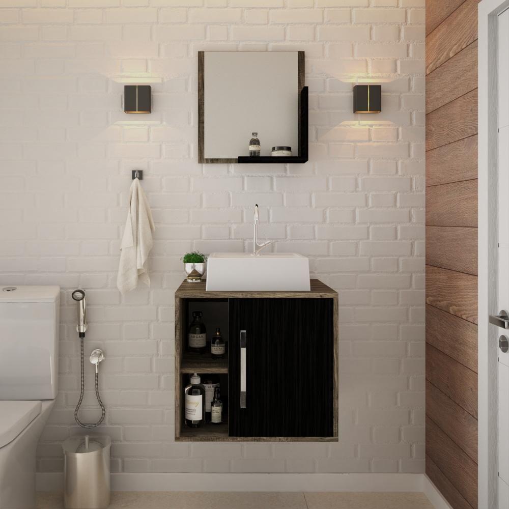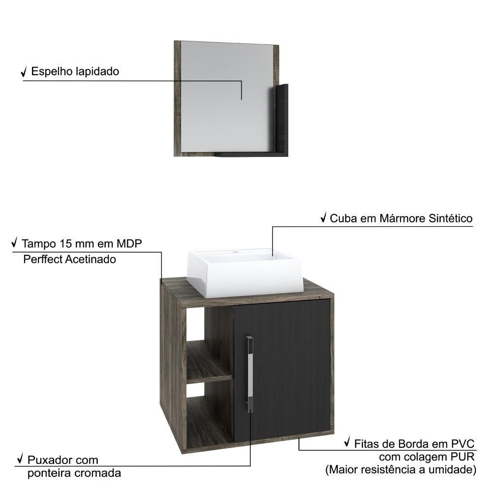 Conjunto Balcão C-cuba Q32 E Espelheira Soft 500 Carvalho Dark C-branco Chess Carvalho Dark C-preto ônix