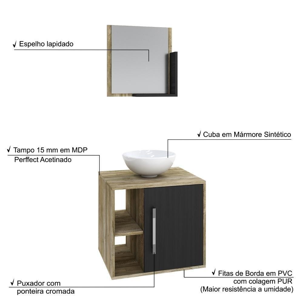Conjunto Balcão C-cuba R30 E Espelheira Soft 500 Carvalho C-branco Chess Carvalho C-preto ônix