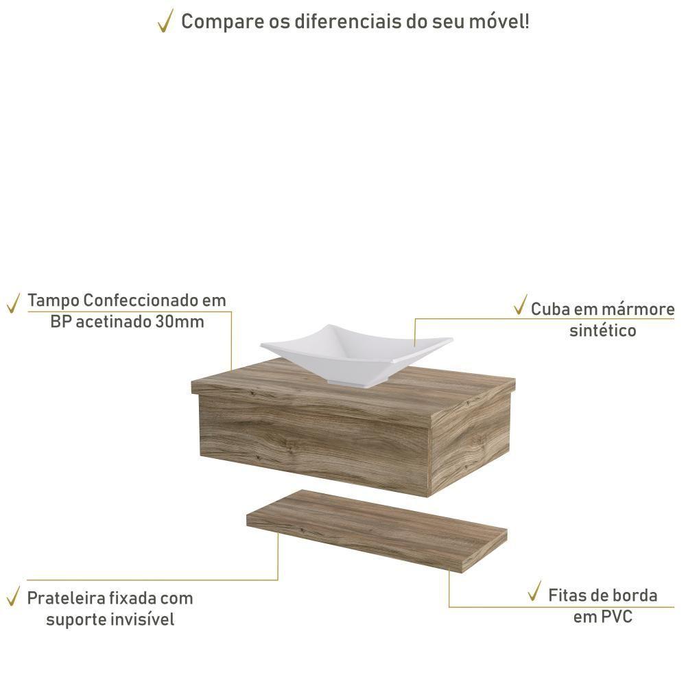Conjunto Bancada C/cuba L30 E Prateleira Metrópole 605 Branco Chess CarvalhoSobre o ProdutoConjunto Bancada C/Cuba L30 e Prateleira Metrópole 605 Branco ChessDescrição do Produto:O Conjunto (Bancada + Cuba + Prateleira) Metrópole KTME605 é um produto compacto de design simples e moderno, projetado para pequenos espaços, perfeito para fazer parte da decoração do seu lavabo ou banheiro. Conta com uma cuba de apoio e uma prateleira com pinos invisíveis, além do suporte linha Metrópole é uma coleção de móveis modernos e com inúmeras possibilidades de composições, combinando design contemporâneo e muita funcionalidade. Diversas possibilidades de cores e modelos de cubas formam uma solução perfeita para as mais opções de decoração e projetos em ambientes de banheiro. É você quem decide!!!Itens Inclusos:1 Conjunto Bancada C/Cuba e PrateleiraDimensões dos Produtos:Bancada: 60 x 43 x 19 cmCuba 29,8 x 29,8 x 11,5 cmInformações Logísticas (Comp. X Prof. X Alt.) 63 x 47 x 26 cm - Peso: 13,51 KgPeso Total: 13,51 KgObservações:Não acompanha acessórios decorativos. Imagens meramente ilustrativas.Informações Técnicas / Características:- Cor do Produto: Branco Chess- Cor do Predominante: Branco- Marca: Compace- Modelo: KTME605- Linha: Metrópole- Material: Mdp - Acabamento: Perffect Acetinado- Escala de Brilho: Fosco- Fita de Borda: Pvc - Possui Gavetas: Não - Material do Puxador: Alumínio- Possui Prateleiras: 1- Peso Máximo por Prateleira: 02 kg- Possui Pés: Não, suspenso - Possui Espelho: Não - Acompanha Cuba / Lavatório: Sim, de Mármore Sintético- Furação para Cuba / Lavatório: Não- Tipo da Cuba: Apoio- Cor da Cuba: Branca- Suporta Até (kg): 12 kg - Peso Lí.: 12,61Kg- Recomendações de Uso, Manutenção e Limpeza: Para a limpeza, utilize flanela seca ou pano macio levemente umedecido em água. Utilize um pano seco em seguida. Evite com produtos químicos (solventes, thinner, acetona, etc) e não utilize nenhum tipo de esponja de aço.- Necessita de Montagem: Sim / Acompanha Manual de Montagem- Complexidade da Montagem: Média: pode ser montado por mais de uma pessoa e/ou necessite de maior conhecimento para montagem.- Garantia: 6 meses- Outras Características: Montagem ível, o suporte toalheiro pode ser montado em qualquer um dos lados. Material: Mdp | Acabamento: Perffect Acetinado | Escala de Brilho: Fosco | Fita de Borda: Pvc | Tipo de Produto: Bancada para Banheiro | Fabricante: Compace | Comprimento: 60 | Limite de unidades por venda: É possível comprar até 1 unidade por venda. | Largura: 42 | Altura: 19 | Quantidade máxima de pedido: 1 | Profundidade: 42 | Preço tabelado: | Cor: Multicolorido | Certificação de teste externa: Não Aplicável | Baterias são necessárias?: false | Palavras-chave de Pesquisa: Não aplicável | Fonte de energia: Não aplicável | Exige montagem: | Principais Características do Produto 0: | Peso do item: | Principais Características do Produto 2: | Dimensões do item P x L x A: | Principais Características do Produto 1: | da peça: | Is Fragile: | Componentes incluídos: | de caixas: | Quantidade de itens: | do modelo: Cor: Carvalho