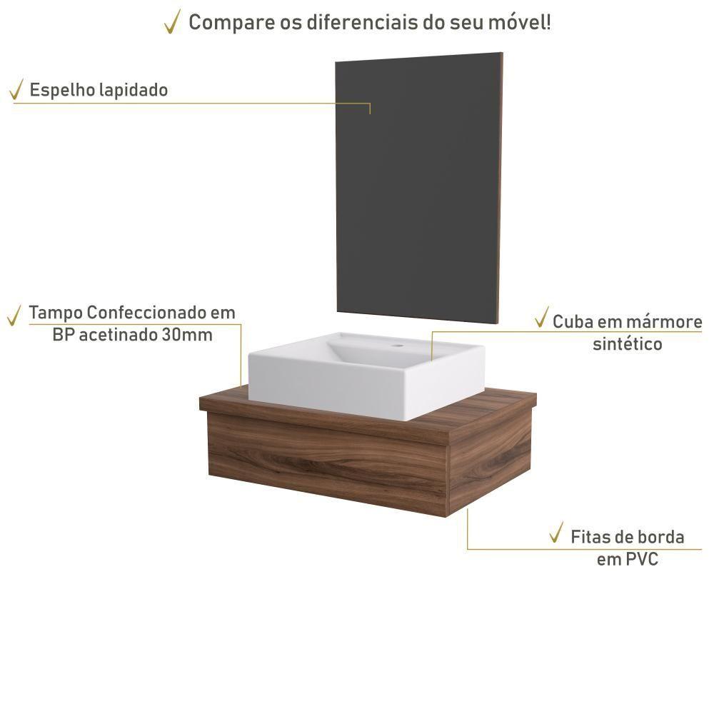 Conjunto Bancada C/cuba Q39 E Espelheira Metrópole 601 Carvalho Dark NogalSobre o ProdutoConjunto Bancada C/Cuba Q39 e Espelheira Metrópole 601 Branco ChessDescrição do Produto:O Conjunto (Bancada + Cuba + Espelheira) Metrópole KTME601 é um produto compacto de design simples e moderno, projetado para pequenos espaços, perfeito para fazer parte da decoração do seu lavabo ou banheiro. Conta com uma cuba de apoio e uma espelheira com espelho lapidado, além do suporte linha Metrópole é uma coleção de móveis modernos e com inúmeras possibilidades de composições, combinando design contemporâneo e muita funcionalidade. Diversas possibilidades de cores e modelos de cubas formam uma solução perfeita para as mais opções de decoração e projetos em ambientes de banheiro. É você quem decide!!!Itens Inclusos:1 Conjunto Bancada C/Cuba e EspelheiraDimensões dos Produtos:Bancada: 60 x 43 x 19 cmEspelheira: 43 x 1,8 x 60 cmCuba 40 x 37,5 x 10 cmInformações Logísticas (Comp. X Prof. X Alt.) 63 x 47 x 26 cm - Peso: 17,84 KgPeso Total: 17,84 KgObservações:Não acompanha acessórios decorativos. Imagens meramente ilustrativas.Informações Técnicas / Características:- Cor do Produto: Branco Chess- Cor do Predominante: Branco- Marca: Compace- Modelo: KTME601- Linha: Metrópole- Material: Mdp - Acabamento: Perffect Acetinado- Escala de Brilho: Fosco- Fita de Borda: Pvc - Possui Gavetas: Não - Material do Puxador: Alumínio - Possui Pés: Não, suspenso - Possui Espelho: Sim - Acompanha Cuba / Lavatório: Sim, de Mármore Sintético- Furação para Cuba / Lavatório: Não- Tipo da Cuba: Apoio- Cor da Cuba: Branca- Suporta Até (kg): 10 kg - Peso Lí.: 16,94Kg- Recomendações de Uso, Manutenção e Limpeza: Para a limpeza, utilize flanela seca ou pano macio levemente umedecido em água. Utilize um pano seco em seguida. Evite com produtos químicos (solventes, thinner, acetona, etc) e não utilize nenhum tipo de esponja de aço.- Necessita de Montagem: Sim / Acompanha Manual de Montagem- Complexidade da Montagem: Média: pode ser montado por mais de uma pessoa e/ou necessite de maior conhecimento para montagem.- Garantia: 6 meses- Outras Características: Montagem ível, o suporte toalheiro pode ser montado em qualquer um dos lados. Material: Mdp | Acabamento: Perffect Acetinado | Escala de Brilho: Fosco | Fita de Borda: Pvc | Tipo de Produto: Bancada para Banheiro | Fabricante: Compace | Comprimento: 60 | Limite de unidades por venda: É possível comprar até 1 unidade por venda. | Largura: 42 | Quantidade máxima de pedido: 1 | Altura: 19 | Profundidade: 42 | Preço tabelado: | Cor: Multicolorido | Certificação de teste externa: Não Aplicável | Baterias são necessárias?: false | Palavras-chave de Pesquisa: Não aplicável | Fonte de energia: Não aplicável | Peso do item: | da peça: | Principais Características do Produto 2: | Componentes incluídos: | Principais Características do Produto 0: | Dimensões do item P x L x A: | Principais Características do Produto 1: | Is Fragile: | Exige montagem: | Quantidade de itens: | do modelo: | de caixas: Cor: Nogal