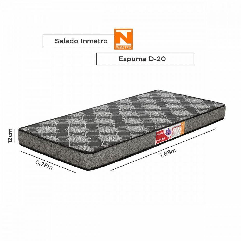 Colchão De Solteiro Violeta D20 078x188x12 Cinza Estampado Prorelax CinzaUma boa noite de sono proporciona diversos beneficios notaveis. Apesar de serem feitos para durar ate 10 anos, a recomendacao e que a troca do colchao seja feita entre 5 e 7 anos, ja que no total passamos pelo menos um terco da vida toda dormindo. Invista em seu conforto!Dimensoes:Altura: 12 cm | Largura: 78 cm | Profundidade: 188 cmCaracteristicas:- Espuma D20 poliuretano- Revestimento Stretch- Pode ser utilizado de ambos os lados- Acabamento: Liso- Tampos inferior, superior e lateral em poliester- Nivel de conforto: Intermediario- Nao possui tratamento Antiacaro, Antialergico e Antifungo- Suporte de peso Individual: 50 kg- Garantia de 6 meses pelo fabricante.AVISO: Esclarecemos que a Opcao Moveis se responsabilizara pela entrega dos produtos adquiridos ate a porta de entrada ou portaria do endereco indicado, ou seja: e de total responsabilidade do cliente a montagem, desmontagem e instalacao do produto adquirido. Para evitar futuros desagrados ou imprevistos com a entrega, tambem e necessario que o cliente confira as dimensoes do produto escolhido, antes de finalizar a compra, devendo certificar-se de que a mercadoria passara normalmente por elevador, porta, escada e corredor.