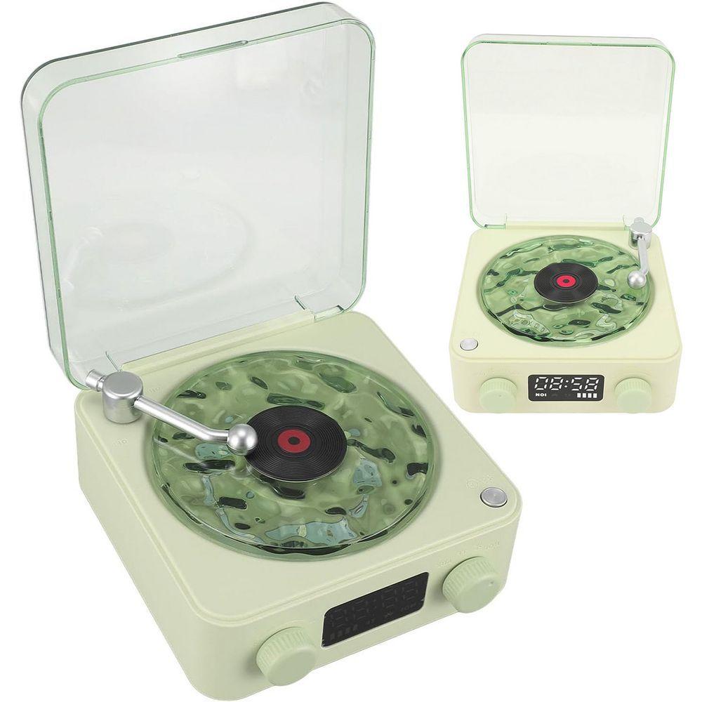 Caixa De Som Toca Disco Vinil Vitrola Bluetooth Cartao Tf Usb Recarregavel Luminaria Musical Rgb Led IluminaçaoATENÇÃO: ESTA CAIXA DE SOM NÃO TOCA DISCO. É SOMENTE UMA CAIXA DE SOM EM FORMATO DE TOCA DISCO.Caixa de Som Retrô que Transforma Qualquer Ambiente em um Refúgio Sensorial!Imagine uma vitrola clássica... agora dê a ela um toque moderno, sons relaxantes, iluminação ambiente e conexão sem fio.Essa é a nossa caixa som em forma de vitrola que também serve como luminária: mais do que uma simples caixa de som, é uma experiência visual, sonora e emocional.Um charme retrô com alma futurista!4 Modos para Relaxar, Curtir e se ConectarNão importa seu momento, temos um modo perfeito para você:Ruído branco: sons da natureza para acalmar a mente, dormir melhor ou se concentrar nos estudos. Inclui som de fogueira, água corrente e ondas do mar suaves.Modo Bluetooth: conecte seu celular e ouça sua playlist favorita sem fio.Modo TF Card: coloque seu cartão de memória e tenha sua trilha sonora pessoal sempre com você.Modo AUX: conecte outros dispositivos com fio e aproveite o som estéreo de qualidade.Deixe o ambiente ainda mais envolvente com a iluminação RGB suave e ajustável. Escolha sua cor favorita ou deixe no modo automático para criar uma atmosfera relaxante, romântica ou criativa. Ideal para noites tranquilas ou momentos especiais.Totalmente recarregável e pronto para te acompanhar onde quiser. Sem fios, sem complicações. Apenas som de qualidade, luz e estilo onde você estiver.ATENÇÃO: ESTA CAIXA DE SOM NÃO TOCA DISCO. É SOMENTE UMA CAIXA DE SOM EM FORMATO DE TOCA DISCO.CaracterísticasCor: VerdeMaterial: Abs + Componentes EletronicosModos: Ruído branco, Bluetooth, Cartão TF, AUXIluminação RGB: PersonalizadaBateria: 1500mAhAlimentação: USBTempo de carregamento: 2 a 3 HorasTempo de reprodução em ruído branco: 6 a 8 HorasTempo de reprodução em Bluetooth: 4 a 6 HorasSom estéreo 360°Design InovadorVintageDecorativoRelaxantePortatilDimensões AproximadasAltura: 5cmLargura: 14cmComprimento: 18cmCaixa de som fechada: 6cmConteúdo da Embalagem1 Caixa de som Vitrola1 Cabo USB3 Meses de Garantia Contra Defeito de Fabricação.*438g MOD: BSL3762