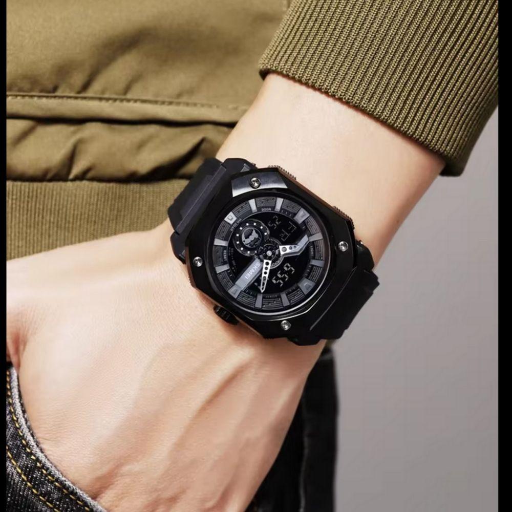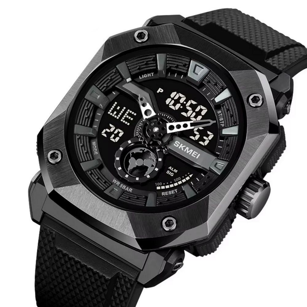 Relógio Esportivo Luz Led Masculino Cronômetro Impermeável Multifuncional PretoPreparado para acompanhar o seu ritmo, o cronômetro surge como uma opção versátil para homens que levam uma vida repleta de atividades. Este relógio esportivo combina funcionalidade avançada com design moderno, oferecendo uma tela analógica-digital que facilita a leitura de tempo mesmo em ambientes escuros, graças à sua prática luz LED. Com resistência à água de até 5 bar, você pode se movimentar sem preocupações, seja na academia, ao ar livre ou em atividades casuais.O material da pulseira, fabricado em silicone de alta qualidade, garante não só conforto, mas também durabilidade para o uso ao longo do dia. Destinado a atender às necessidades funcionais dos tempos modernos, é um companheiro ideal para homens que desejam um relógio que seja ao mesmo tempo elegante e resistente. [Tecnologia Avançada]Com um movimento digital preciso, oferece funcionalidades como o temporizador de contagem regressiva triplo, ideal para manter o controle das atividades diárias com eficiência. [Conforto e Estilo]Equipado com uma pulseira ajustável em silicone, o relógio proporciona um uso confortável e se adapta com facilidade a qualquer ocasião, do ambiente de trabalho ao lazer. [Durabilidade Extrema]O estojo de aço inoxidável robusto oferece resistência impressionante, permitindo um uso intenso sem comprometer o estilo ou a funcionalidade. [Design Moderno]O modelo traz um visual fashion e casual que se destaca, sendo facilmente combinável com diferentes trajes, garantindo que você esteja sempre no topo do estilo. [Funções Práticas]Com a sua tela de LED luminoso, o relógio permite a leitura fácil em qualquer situação, tornando-o indispensável para quem vive um estilo de vida ativo.