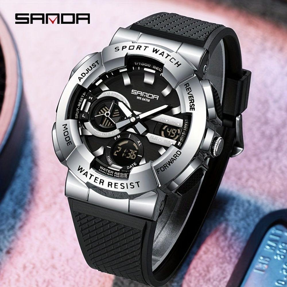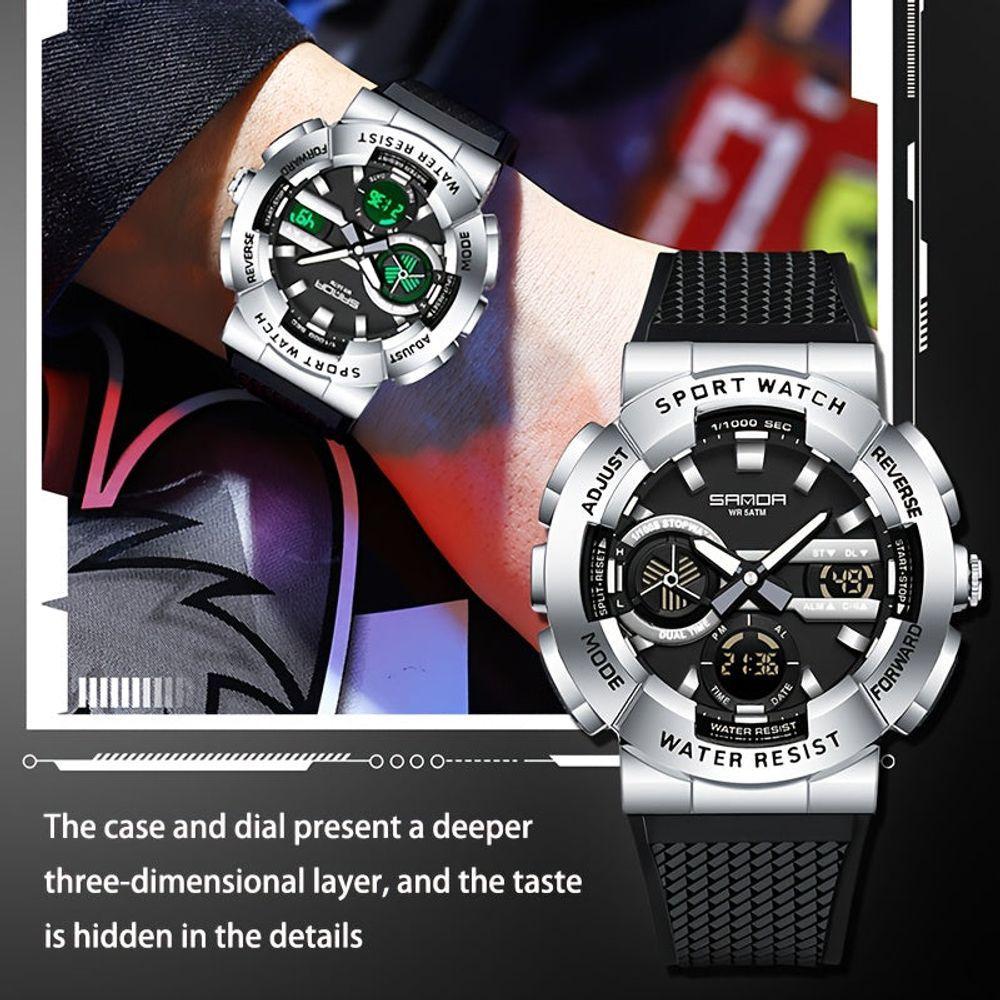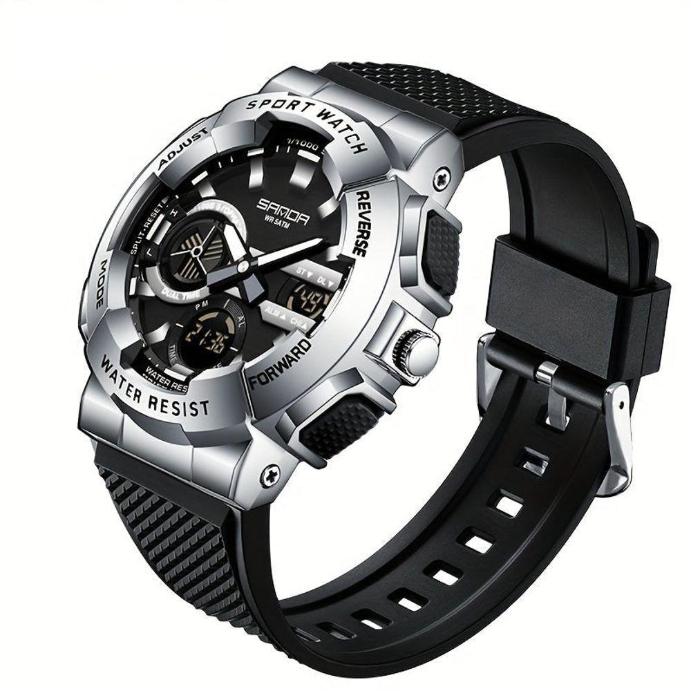 Relógio Eletrónico Desportivo, 3 Zonas De Tempo, À Prova Da Água 5atm PrateadoDescubra o relógio eletrónico desportivo para homem, uma verdadeira fusão de tecnologia e estilo. Este relógio é a escolha ideal para aqueles que procuram um acessório que vá além da mera contagem do tempo. Com um design robusto e moderno, ele se adapta perfeitamente a diferentes ocasiões, sejam elas desportivas ou casuais. Seja na escola, em férias ou até mesmo em celebrações de aniversário, este relógio se destaca como uma peça essencial no seu dia a dia.Equipado com um ecrã nítido, que oferece uma clara visualização das horas em três zonas de tempo distintas, este relógio é resistente à água até 5ATM. A sua caixa e mostrador metálicos proporcionam uma durabilidade impressionante, assegurando que o relógio perdure em grandes aventuras. Não perca a oportunidade de enriquecer o seu estilo com este relógio desportivo único.