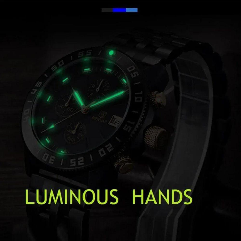 Relógio Marca Superior De Luxo Quartzo Benyar Aço Inoxidável Preto AzulDescubra o fascinante mundo da precisão e do design refinado com o relógio masculino Benyar. Exibindo um estilo que harmoniza elegância e funcionalidade, este relógio de luxo é um companheiro ideal para aqueles que valorizam tanto a moda quanto a durabilidade. Feito com aço inoxidável de alta qualidade, ele é resistente à água, garantindo desempenho superior em qualquer ambiente enquanto adiciona um toque sofisticado ao seu look diário.Equipado com um mecanismo de quartzo excepcionalmente preciso, o relógio Benyar não é apenas uma declaração de moda, mas também um instrumento confiável para a medição do tempo. O mostrador de hardlex protege o design intricado contra arranhões, enquanto o formato redondo clássico e o fecho de bracelete elegante promovem um uso confortável e seguro. Este relógio esportivo não é apenas um acessório, mas uma extensão de sua personalidade marcante. Especificações: [Qualidade do Material] Feito com uma pulseira de aço inoxidável que dura no tempo; o material do visor em hardlex resiste ao uso diário. [Versatilidade de Funções] Apresenta múltiplos fusos horários, cronógrafo e um calendário completo para estar sempre atualizado em qualquer lugar. [Design Resistente] Resistente à água até 5bar, este relógio foi projetado para suportar sua vida dinâmica com um estilo impermeável. [Estilo e Conforto] Diâmetro entre 40 a 44 mm e espessura de 12,4 mm, complementado por uma largura de banda que varia de 20 a 24 mm, maximizando o conforto sem comprometer o estilo moderno. [Durabilidade Estética] A liga mate do material do estojo não só contribui para um visual esteticamente agradável, mas também garante uma estrutura resistente a choques.