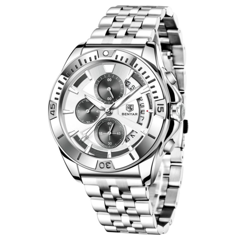 Relógio Masculino De Pulso Quartzo Em Aço Inoxidável Esportivo à Prova D´agua BrancoDescubra a combinação perfeita de estilo e funcionalidade com os novos relógios masculinos de quartzo, uma verdadeira obra-prima de design. Estes relógios, projetados para o homem moderno, oferecem uma fusão elegante de luxo e desempenho esportivo, garantindo que você esteja sempre no controle do seu tempo e estilo. Com uma face de aço inoxidável robusta e um acabamento sofisticado, cada detalhe foi cuidadosamente considerado para proporcionar uma experiência de uso incomparável.O design arrojado e sofisticado é complementado por recursos avançados que atendem às necessidades do dia a dia. Seja em uma reunião de negócios ou em uma aventura ao ar livre, este relógio adapta-se perfeitamente, oferecendo resistência à água e recursos como cronômetro e cronógrafo. Seu mostrador luminescente assegura visibilidade em qualquer condição, destacando-se como um acessório essencial para qualquer ocasião.Especificações do Produto[Recurso de design arrojado]: Com um estojo de aço inoxidável de 14mm de espessura, este relógio traz uma combinação de durabilidade e estilo que é simultaneamente moderna e clássica, perfeitamente ajustável a qualquer pulso com sua largura de banda entre 20 a 24 mm.[Funcionalidade à prova d’água]: Resistente até 3 Bar, este relógio é feito para suportar o ritmo da vida, sejam chuvas inesperadas ou momentos de aventura aquática, mantendo-se sempre operacional e confiável.[Tecnologia de movimento preciso]: Equipado com movimento QUARTZ de ponta, oferece marcação precisa, complementado por um cronômetro para cronogramas rigorosos e um calendário completo para planejamento à frente.[Visor aprimorado]: O visor feito de Hardlex oferece resistência superior contra riscos, enquanto suas mãos luminosas garantem leitura fácil do tempo, mesmo nas situações mais desafiantes de luz.[Estilo e conforto]: A pulseira de aço inoxidável com fecho dobrável de segurança proporciona um ajuste confortável para uso prolongado sem comprometer o estilo fashion e casual que se deseja.