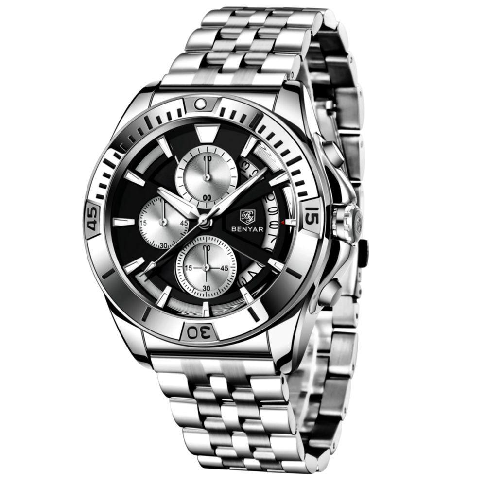 Relógio Masculino De Pulso Quartzo Em Aço Inoxidável Esportivo à Prova D´agua PretoDescubra a combinação perfeita de estilo e funcionalidade com os novos relógios masculinos de quartzo, uma verdadeira obra-prima de design. Estes relógios, projetados para o homem moderno, oferecem uma fusão elegante de luxo e desempenho esportivo, garantindo que você esteja sempre no controle do seu tempo e estilo. Com uma face de aço inoxidável robusta e um acabamento sofisticado, cada detalhe foi cuidadosamente considerado para proporcionar uma experiência de uso incomparável.O design arrojado e sofisticado é complementado por recursos avançados que atendem às necessidades do dia a dia. Seja em uma reunião de negócios ou em uma aventura ao ar livre, este relógio adapta-se perfeitamente, oferecendo resistência à água e recursos como cronômetro e cronógrafo. Seu mostrador luminescente assegura visibilidade em qualquer condição, destacando-se como um acessório essencial para qualquer ocasião.Especificações do Produto[Recurso de design arrojado]: Com um estojo de aço inoxidável de 14mm de espessura, este relógio traz uma combinação de durabilidade e estilo que é simultaneamente moderna e clássica, perfeitamente ajustável a qualquer pulso com sua largura de banda entre 20 a 24 mm.[Funcionalidade à prova d’água]: Resistente até 3 Bar, este relógio é feito para suportar o ritmo da vida, sejam chuvas inesperadas ou momentos de aventura aquática, mantendo-se sempre operacional e confiável.[Tecnologia de movimento preciso]: Equipado com movimento QUARTZ de ponta, oferece marcação precisa, complementado por um cronômetro para cronogramas rigorosos e um calendário completo para planejamento à frente.[Visor aprimorado]: O visor feito de Hardlex oferece resistência superior contra riscos, enquanto suas mãos luminosas garantem leitura fácil do tempo, mesmo nas situações mais desafiantes de luz.[Estilo e conforto]: A pulseira de aço inoxidável com fecho dobrável de segurança proporciona um ajuste confortável para uso prolongado sem comprometer o estilo fashion e casual que se deseja.