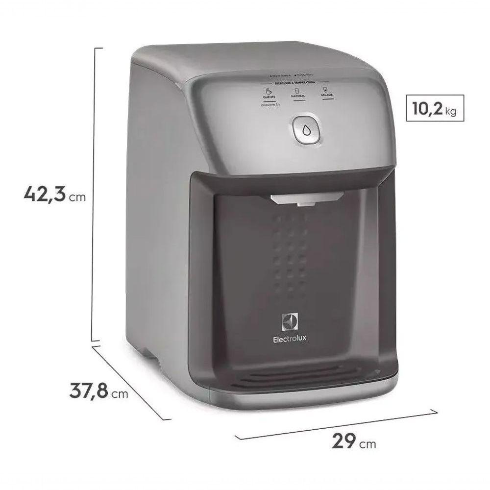 Purificador De água PH41X Electrolux Quente Natural Gelada 110VVOLTAGEM 127VCOR CINZAO Purificador de Água PH41X da Electrolux é a solução ideal para quem busca qualidade e praticidade na hora de beber água. Com um design compacto, suas dimensões de 37,8 cm de profundidade, 42,3 cm de altura e 29 cm de largura permitem que ele se encaixe facilmente em qualquer ambiente, seja doméstico ou comercial.Este purificador possui um fluxo máximo de 45 litros por hora, garantindo água filtrada e pronta para o consumo a qualquer momento. Com um sistema de filtragem em três etapas, ele retém impurezas e cloro, proporcionando uma água mais pura e saudável para você e sua família.Fabricado em plástico resistente, o PH41X tem uma vida útil de um ano, oferecendo durabilidade e eficiência. Embora não seja portátil, sua montagem simples facilita a instalação em diversos locais, tornando-o uma escolha prática para quem valoriza a qualidade da água.VOLTAGEM 127VCOR CINZAO Purificador de Água PH41X da Electrolux é a solução ideal para quem busca qualidade e praticidade na hora de beber água. Com um design compacto, suas dimensões de 37,8 cm de profundidade, 42,3 cm de altura e 29 cm de largura permitem que ele se encaixe facilmente em qualquer ambiente, seja doméstico ou comercial.Este purificador possui um fluxo máximo de 45 litros por hora, garantindo água filtrada e pronta para o consumo a qualquer momento. Com um sistema de filtragem em três etapas, ele retém impurezas e cloro, proporcionando uma água mais pura e saudável para você e sua família.Fabricado em plástico resistente, o PH41X tem uma vida útil de um ano, oferecendo durabilidade e eficiência. Embora não seja portátil, sua montagem simples facilita a instalação em diversos locais, tornando-o uma escolha prática para quem valoriza a qualidade da água.