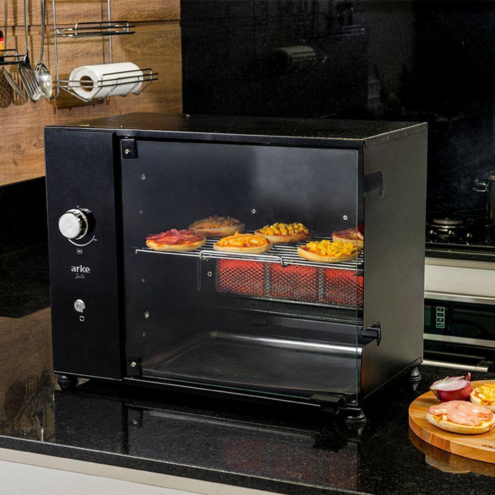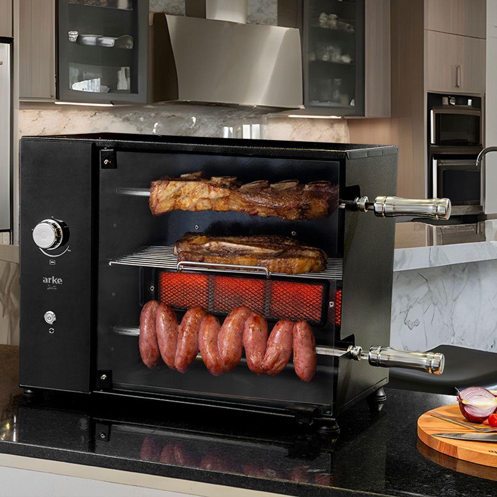Churrasqueira A Gás GLP Rotativa Elétrica 2 Espetos + Grelha Acendimento Manual Duetto 220V ArkeA Churrasqueira Assador Rotativo Elétrico a Gás GLP Duetto é uma ótima opção para momentos descontraídos com a família ou grupo de amigos. Ela possui um sistema de rotação de espetos que permite assar de forma homogênea todos os tipos de carnes. Seu queimador infravermelho proporciona um sabor ainda mais especial aos alimentos. Com pés antiderrapantes, garante e estabilidade durante o uso, além de ser produzida em aço carbono com pintura epóxi, o que aumenta a durabilidade e facilita a limpeza.Além disso, possui uma grelha em aço inox AISI 304, ideal para grelhar carnes, legumes e outros alimentos. O design funcional conta com um painel de vidro e botão de LED, oferecendo maior elegância e sofisticação.Características:Produzido em Aço CarbonoPintura EpóxiPainel de VidroAcendimento ManualQueimador InfravermelhoGarantia de 6 MesesAlimentação a Gás P13 GLP (O assador é configurado conforme o tipo de gás escolhido e não pode ser utilizado com outro tipo de alimentação)Informações Técnicas:Altura: 42,6 cmLargura: 55,2 cmProfundidade: 33,5 cmPeso: 13,5 kgItens Inclusos:1 Churrasqueira Rotativa1 Bandeja Coletora de Gordura2 Espetos Simples1 Grelha4 Pés de Apoio em BorrachaManual de InstruçãoTempo Médio para Assar:Salsichão: 30 minCarne de Gado: 40 minCarne Suína: 50 minCarne de Frango em Pedaços: 50 min