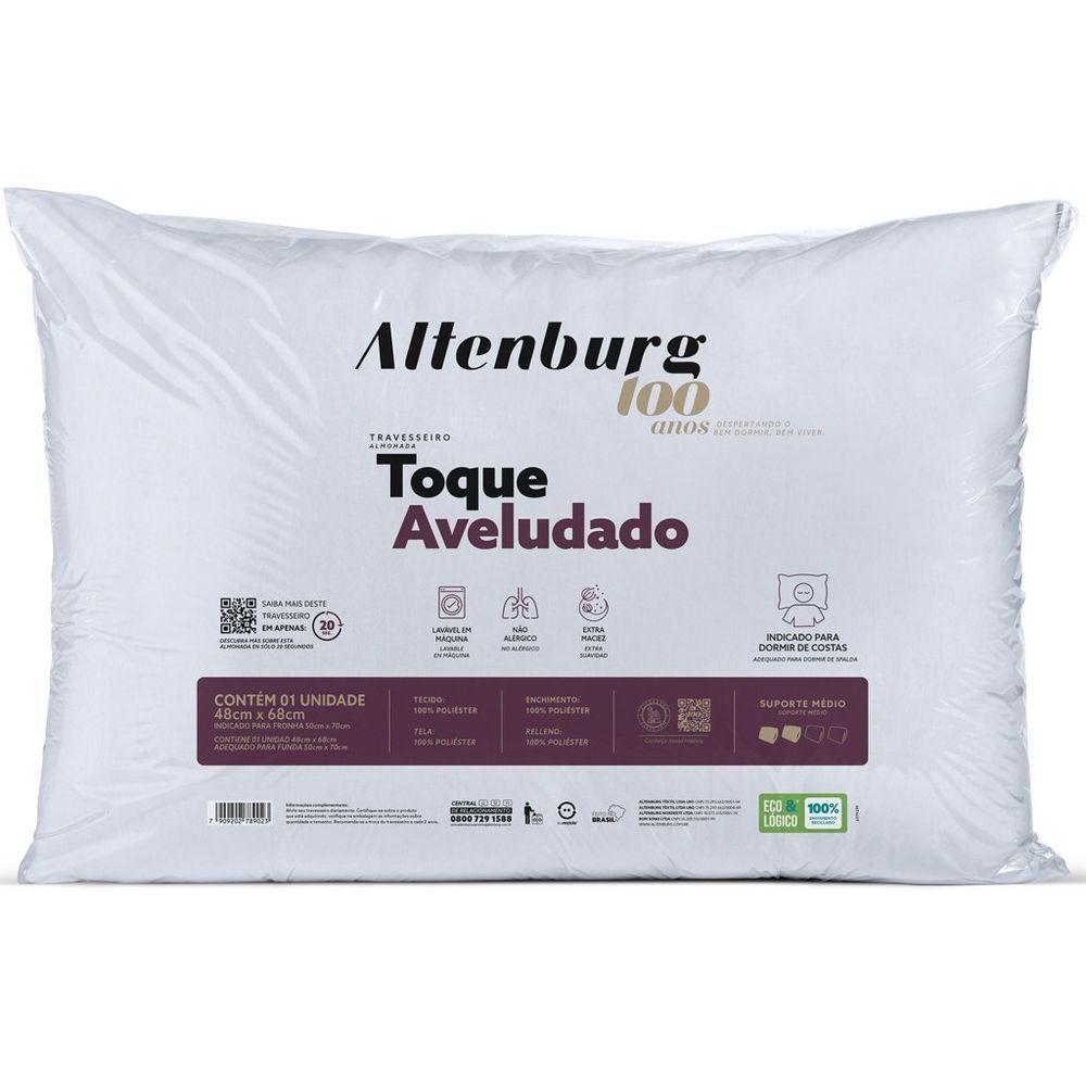 Travesseiro Toque Aveludado Suporte Médio 48x68cm Altenburg BrancoTravesseiro Toque Aveludado Suporte Médio 48x68cm Altenburg Branco -O Travesseiro Toque Aveludado Altenburg oferece conforto e suporte equilibrado para noites de sono revigorantes. Fabricado em 100% poliéster, possui enchimento com toque extra macio e revestimento suave, que garante sensação de aconchego.Seu suporte médio é ideal para quem dorme de costas, mantendo o alinhamento da cabeça e da coluna.Além disso, é antialérgico e lavável em máquina, garantindo praticidade e higiene no dia a dia.Produto com acabamento de alta qualidade, toque aveludado e durabilidade superior.Perfeito para quem busca conforto, bem-estar e cuidado com a saúde do sono.Características Gerais do Produto: - Antialérgico: Sim - Composição: 100% Poliéster - Lavável em Máquina de Lavar?: Sim - Posição de Dormir: Dormir de Costas - Toque: Toque Aveludado - Material: Poliéster - Dupla Face: Sim - Material do Enchimento: 100% Poliéster - Informações Adicionais: Suporte Médio; Extra Maciez; - Cuidados com a Peça: Evitar produtos à base de Cloro; Evitar Secadora; Lavar separadamente de outros tipos de tecidos - Largura (cm): 48.00 - Comprimento (cm): 68.00 - Peso (g): 488.00Acompanha o produto: - 1 Travesseiro Toque Aveludado Suporte Médio 48x68cm Altenburg Garantia: - 3 meses