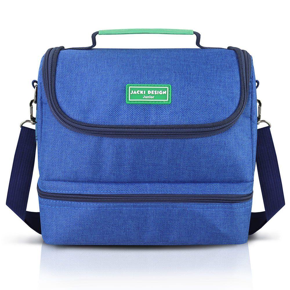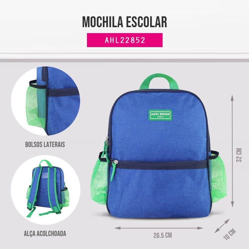 Kit Mochila Escolar, Lancheira Térmica, Pote P/ Lanche E Garrafa 460ml Infantil AzulKit Mochila Escolar, Lancheira Térmica, Pote p/ Lanche e Garrafa 460ml Infantil - Azul Azul -Kit Completo para Estudantes: Praticidade e Conforto para o Dia a DiaLancheira Térmica: A lancheira térmica de 2 compartimentos é perfeita para as crianças. Com alça de mão, alças ajustáveis e revestimento interno em folha de alumínio, mantém os alimentos frescos por mais tempo. Ideal para passeios, viagens ou para a escola.Garrafa Infantil de 460ml: A garrafa combina um design ergonômico com funcionalidade prática. Com capacidade de 460ml, ela conta com um canudo retrátil, uma trava e vedação para evitar vazamentos, e uma alça ajustável para facilitar o transporte. Ideal para líquidos em passeios, viagens ou na escolinha, é livre de BPA e reflete a qualidade Jacki Design.Lancheira de 2 Andares: Torne a hora do lanche mais divertida e organizada com o pote de 2 andares. Com capacidade de 400ml, esta lancheira possui divisórias na parte inferior para separar os alimentos e uma bandeja superior com encaixe para os talheres incluídos no kit. A tampa tem fechamento em travas de segurança, garantindo praticidade e segurança. Livre de BPA, é perfeita para passeios, viagens e escolinha, oferecendo qualidade Jacki Design.Mochila: A Mochila escolar foi projetada para estudantes de todas as idades. Feita de microfibra resistente, conta com alças acolchoadas para maior conforto, bolsos laterais para garrafa, compartimento frontal e fecho em zíper, combinando estilo e funcionalidade para o dia a dia na escola.Mochila: Comprimento: 26,5cm x Largura: 10cm x Altura: 32cmBolsa Térmica: Comprimento: 22cm x Largura: 12cm x Altura: 18cmMarmita: Comprimento: 13,7cm x Largura: 10,2cm x Altura: 8,1cmGarrafa: Comprimento: 8cm x Largura: 8cm x Altura: 18cm