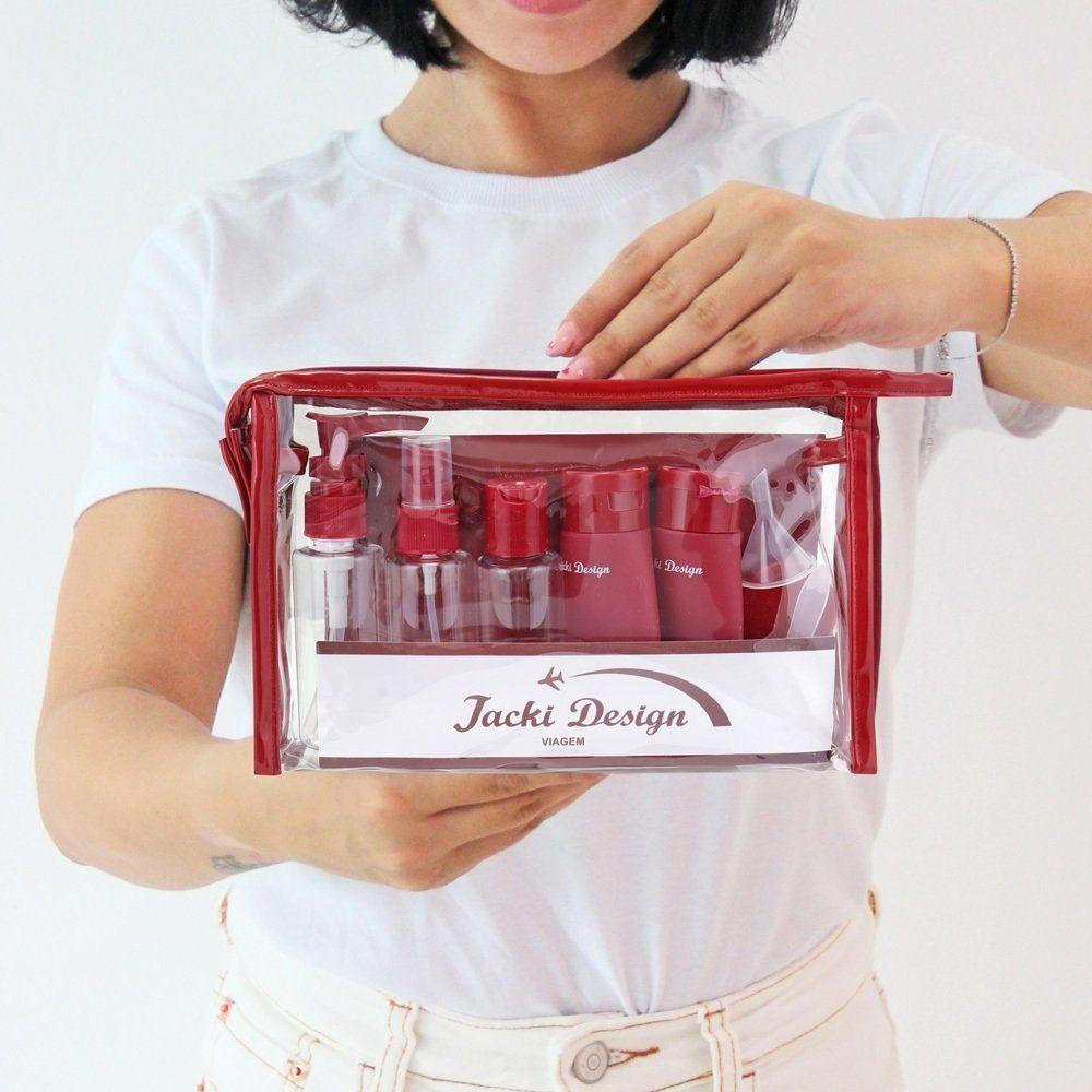 Kit De Bolsa Transparente E Frascos De Viagem De 10 Peças VinhoKit de Bolsa Transparente e Frascos de Viagem de 10 Peças Vinho -Kit Bolsa Transparente com Frascos de Viagem 10 Peças – Jacki Design | Coleção LOVEO Kit Bolsa Transparente com Frascos de Viagem da Jacki Design une praticidade e charme para acompanhar você em todas as ocasiões. Ideal para transportar cosméticos e itens de higiene com segurança, ele combina uma bolsa elegante com um conjunto completo de frascos, tudo com o padrão de qualidade Jacki Design.Bolsa Transparente – Coleção LOVEDesign moderno com detalhes em formato de coraçãoFecho em zíper e pin dourado Jacki DesignAmplo espaço interno, fácil de limpar e impermeável Medidas da bolsa: 31 cm (C) x 12 cm (L) x 22 cm (A) Material: 80% PVC | 20% PUKit de Frascos para Viagem – 10 Peças01 Nécessaire transparente (PVC)01 Frasco com válvula pump (50 ml)01 Frasco spray (50 ml)01 Frasco com tampa disk top (50 ml)02 Frascos de silicone flexíveis (60 ml cada)02 Potes para cremes ou sólidos (10 g cada)01 Funil para envase01 Espátula para manuseio de produtos Medidas da nécessaire: 20,5 cm (C) x 14 cm (L) x 5 cm (A) Material dos frascos: PS e siliconeDiferenciais Jacki DesignAprovado para bagagem de mãoEvita vazamentos, ideal para viagensFácil de transportar, leve e reutilizávelCombina com malas e frasqueiras da Coleção LOVEVersátil, seguro e com acabamento impecável, este kit é perfeito para lojistas que buscam oferecer praticidade com estilo para suas clientes.