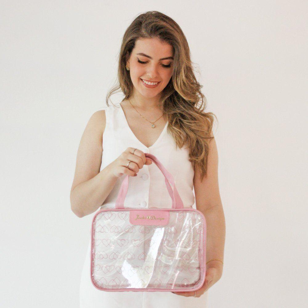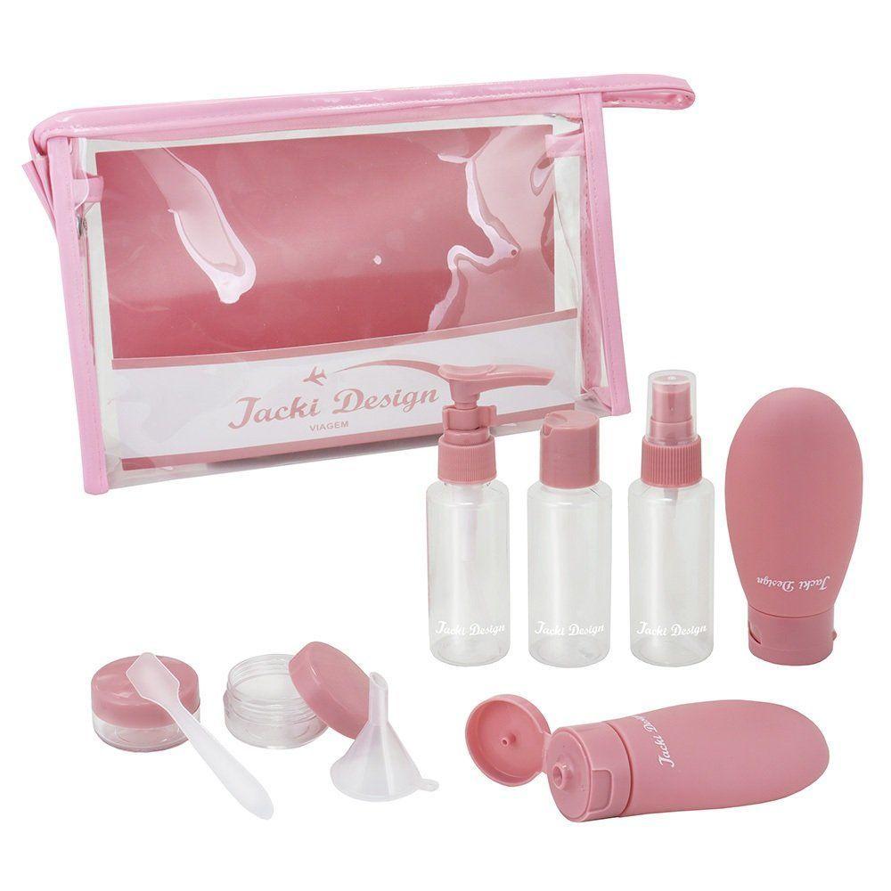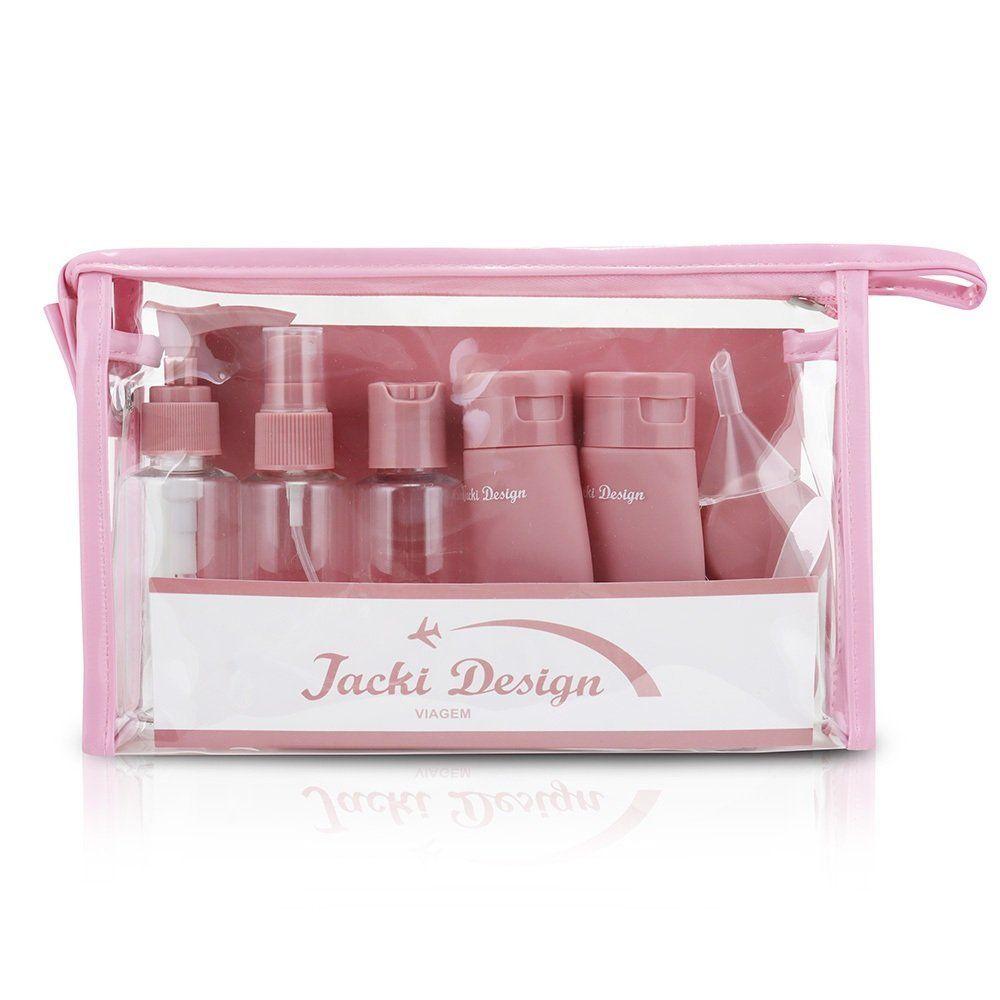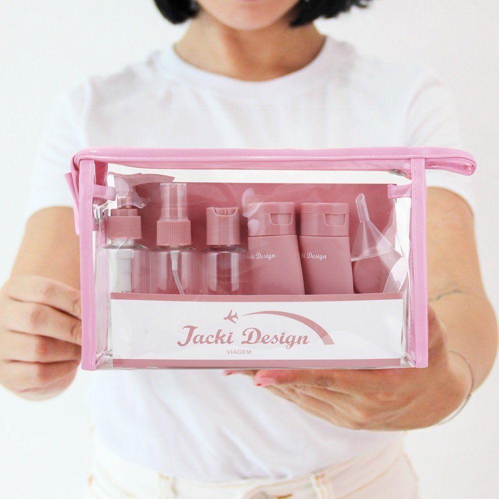 Kit De Bolsa Transparente E Frascos De Viagem De 10 Peças RosaKit de Bolsa Transparente e Frascos de Viagem de 10 Peças Rosa -Kit Bolsa Transparente com Frascos de Viagem 10 Peças – Jacki Design | Coleção LOVEO Kit Bolsa Transparente com Frascos de Viagem da Jacki Design une praticidade e charme para acompanhar você em todas as ocasiões. Ideal para transportar cosméticos e itens de higiene com segurança, ele combina uma bolsa elegante com um conjunto completo de frascos, tudo com o padrão de qualidade Jacki Design.Bolsa Transparente – Coleção LOVEDesign moderno com detalhes em formato de coraçãoFecho em zíper e pin dourado Jacki DesignAmplo espaço interno, fácil de limpar e impermeável Medidas da bolsa: 31 cm (C) x 12 cm (L) x 22 cm (A) Material: 80% PVC | 20% PUKit de Frascos para Viagem – 10 Peças01 Nécessaire transparente (PVC)01 Frasco com válvula pump (50 ml)01 Frasco spray (50 ml)01 Frasco com tampa disk top (50 ml)02 Frascos de silicone flexíveis (60 ml cada)02 Potes para cremes ou sólidos (10 g cada)01 Funil para envase01 Espátula para manuseio de produtos Medidas da nécessaire: 20,5 cm (C) x 14 cm (L) x 5 cm (A) Material dos frascos: PS e siliconeDiferenciais Jacki DesignAprovado para bagagem de mãoEvita vazamentos, ideal para viagensFácil de transportar, leve e reutilizávelCombina com malas e frasqueiras da Coleção LOVEVersátil, seguro e com acabamento impecável, este kit é perfeito para lojistas que buscam oferecer praticidade com estilo para suas clientes.