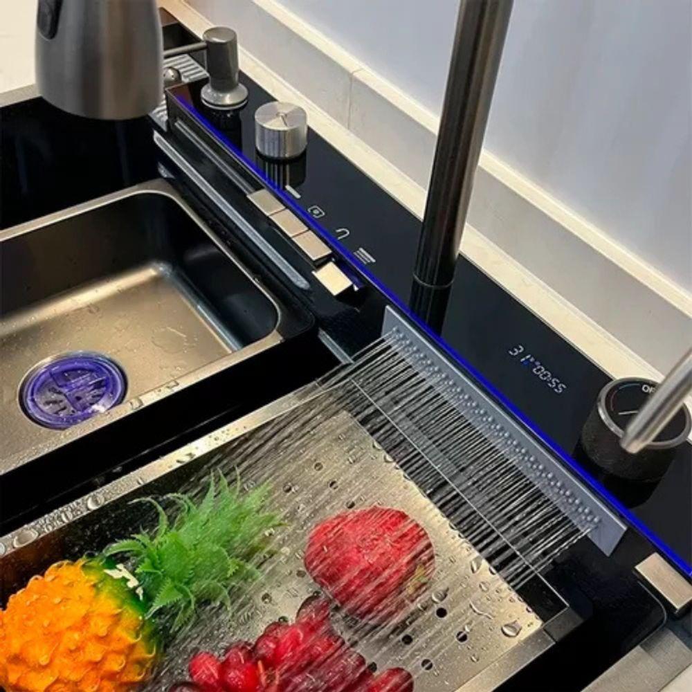 Cuba Gourmet Multifuncional Inteligente Aço Inox 304 Preta 75x46x22cm Kit Completo DomumCuba Gourmet Multifuncional Inteligente Aço Inox 304 Preta 75x46x22cm Kit Completo Domum - Versatilidade de sobra para sua cozinha!Sofisticação e Tecnologia Avançada!Beleza, praticidade e durabilidade incomparáveis. Com pintura eletrostática e nanotecnologia anti-risco, ela resiste a riscos e ferrugem, mantendo o brilho e a integridade ao longo do tempo.Versatilidade!Projetada para simplificar sua rotina oferecendo recursos exclusivos como lavador de copos, torneira com spray cascata e cinco modos de jato de água, além de um display digital para controle da temperatura da água.Praticidade e Conforto na Cozinha!Equipado com um sistema antirruído e um fundo em formato de X para melhor drenagem, proporcionando uma experiência silenciosa e prática. Ideal para cozinhas, bares ou varandas, é espaçosa e evita que o som do fluxo de água ecoe, promovendo um ambiente mais tranquilo e organizado. Características Gerais do Produto:- Com Acessórios: Sim- Espessura do Inox: 3mm- Marca: Domum- Acabamento: Aço Inox com Pintura Eletrostática com Nanotecnologia- Dimensões do Produto (A x L x P): Largura: 75cm | Comprimento: 46cm | Altura: 22cm- Furo de Válvula: 4.1/2''- Garantia: 01 Ano ( 90 Dias direto com a loja, após diretamente com o fabricante)- Material: Aço Inox 304- Cor: PretoAcompanha o produto:- 01 Cuba Gourmet Quadrada Aço Inox 304 01 Torneira Monocomando com Cascata Spray 01 Lavador de Copos 01 Válvula de escoamento 01 Válvula e tubulação do ladrão 01 Dosador de detergente 500ml 01 Cesto Escorredor Aço Inox 304 01 Cesto para lavagem de alimentos 01 Tábua de CorteGarantia:- 01 Ano ( 90 Dias direto com a loja, após diretamente com o fabricante)