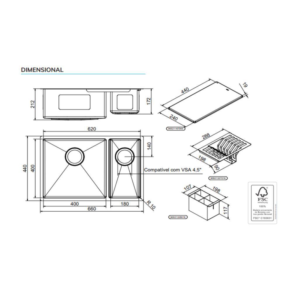 Cuba Dupla Bistrô 60x40x20 Escovado Com Canal Equipado 4,5 FSC100% DocolCuba Dupla Bistrô 60x40x20 Escovado com Canal Equipado 4,5 FSC100% Docol - Espaço e Funcionalidade de sobra para sua cozinha!Design Industrial e Funcionalidade!A Cuba Dupla Bistrô 60x40x20 Escovado combina um design industrial moderno com alta funcionalidade. Seu acabamento escovado oferece um visual elegante, enquanto o canal equipado de 4,5 proporciona organização e praticidade, ideal para cozinhas ou áreas gourmet.Sustentabilidade e Versatilidade!Sua dupla cuba permite separar tarefas, como lavar e enxaguar, enquanto o canal equipado facilita o armazenamento de acessórios. Perfeita para quem busca estilo, funcionalidade e consciência ambientalCaracterísticas Gerais do Produto:- Marca: Docol- Linha: Bistrô- Acabamento: Escovado- Dimensões do Produto (A x L x P): Altura: 20cm | Largura: 60cm| Profundidade: 40cm- Espessura: 1 mm- Formato: Retangular- Ladrão: Sim- Material: Aço Inox AISI 304- Profundidade: 21cm- Furo de Válvula: 4,5- Ambientes Indicados: Cozinhas- Garantia: 01 Ano ( 90 Dias direto com a loja, após diretamente com o fabricante)Acompanha o produto:- 01 Cuba Dupla 01 Manual (gabarito) 02 Válvulas de saída d’água 4.5” 01 Sifão Duplo Extensível 72cm 01 Escorredor 01 Escorredor de TalheresGarantia:- 03 MESES