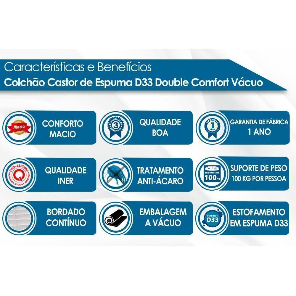 Colchão Casal Enrolado A Vácuo Espuma D33 Gel Comfort Double Face Bed In Box (138x188x17) - Castor Colchão Casal Enrolado a Vácuo Espuma D33 Gel Comfort Double Face Bed in Box (138x188x17) - CastorMarca: CastorDimensões(Cm): Comprimento(Profundidade): 188cm x Largura: 138cm x Altura: 17cm COLCHÃO (BENEFÍCIOS) Vantagens Extras de Colchão - Embalado a Vácuo Tecido com Tratamento - AntiÁcaro e AntiFungo Tipo de Bordado do Tecido de Revestimento - Contínuo Tipo Tecido de Forração Revestimento - Malha de Alta Qualidade Tipo de Tecido de Revestimento da Faixa Lateral - Malha Cor do Tecido de Revestimento da Faixa Lateral - Clara Cor do Tecido do Tampo - Claro Modo de Utilização - Double Side COLCHÃO (CARACTERISTICAS) Camadas Interna do Estofamento de Espuma - D33 Tipo de Espuma - Espuma de Poliol Vegetal Densidade da Espuma - D33 Nível de Firmeza do Colchão - Macio Peso Máximo Suportado - 110 kg COLCHÃO (QUALIFICAÇÕES) Certificados de Qualidade - Qualidade Aprovada - Qualidade Costa Rica - ISO 9001 - INER Pró Espuma Nossa Avaliação - Qualidade Boa Tempo de Garantia - 12 mesesImagens Meramente Ilustrativas.Não nos responsabilizamos pela montagem/instalação dos produtos.Todas as informações divulgadas são de responsabilidade exclusiva do fabricante/fornecedor. Tipo Tecido de Forração Revestimento: Malha de Alta Qualidade | Nível de Firmeza do Colchão: Macio | Nossa Avaliação: Qualidade Boa | Peso Máximo Suportado: 110 kg | Tempo de Garantia: 12 meses | Vantagens Extras de Colchão: Embalado a Vácuo | Certificados de Qualidade: Qualidade Aprovada | Tipo de Tecido de Revestimento da Faixa Lateral: Malha | Cor do Tecido do Tampo: Claro | Tipo de Bordado do Tecido de Revestimento: Contínuo | Tecido com Tratamento: AntiÁcaro e AntiFungo | Modo de Utilização: Double Side | Camadas Interna do Estofamento de Espuma: D33 | Cor do Tecido de Revestimento da Faixa Lateral: Clara | Densidade da Espuma: D33 | É infantil: Não | É eco-friendly: Sim | É antiácaros: Sim | É ortopédico: Sim | É kit: Não | Tipo de Espuma: Espuma de Poliol Vegetal | Material: Tecido | Fonte do produto: N/A | Com moldura perimetral: Não | Com pegas laterais: Não | Número de registro/certificação INMETRO: N/A | Condição do item: Novo | Classificação da Cama: Casal | Produto: N/A | Cômodo Indicado: Multiuso | Código universal de produto (GTIN): 7895606562914 | Produto precisa de Montagem?: Sim, a montagem é simples mas sugerimos a contratação do nosso serviço de montagem (para os CEPs em que o serviço está disponível) ou de algum profissional experiente de sua preferência | Descrição do Tamanho: 17.00x:138.00x188.00 cm | Estado de Origem: RJ | País de origem: Nacional | Peso Produto Com Embalagem (Kg): 33.08 | Material para Filtro: N/I | Cor Mobly: N/I | Condição do Item: Novo | Link Site: https://www.costaricacolchoes.com.br/produtos.asp?produto=39422 | Numeral: 0 | Não se Aplica: N/A | Não Possui: Não | Link Youtube: https://www.youtube.com/watch?v=0LcSiaveiAE | ID Youtube: 0LcSiaveiAE | Linha/Modelo: Castor | Cor Cnova: Blush | Cor Meli: Ciano | Contatos Sac Fábrica: sacmg@castor.ind.br/sac3@castor.ind.br | Categoria Trilha: Colchão> Colchão Enrolado a Vácuo | Categoria - Sub: Colchão Enrolado a Vácuo | Categoria - Pai: Colchão | Comprimento Embalagem: 188.00 | Largura Embalagem: 138.00 | Altura Embalagem: 17.00 | Peso: 33.08 Kg | Kit: 0 | Peso Real Kg: 33.08 | Peso Cubado: 110.26 | Volumes: 1 | M3: 0.44 | Comprimento/Profundidade: 188 cm | Largura: 138 cm | Altura: 17 cm | Tamanho Montado: Larg:138.00 x Comp/Prof:188.00 x Alt: 17.00 | Comprimento/Profundidade Montado: 188.00 | Largura Montado: 138.00 | Altura Montado: 17.00 | Tamanho Cama Colchão: Casal | Data Cadastro: 2024-1-12 12:17:30 | Sigla Estoque: 12 | Marca: Castor