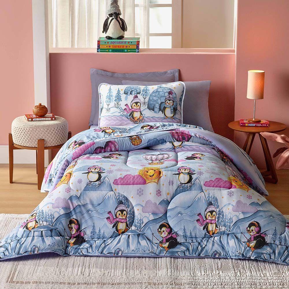 Kit Edredom Alegria Dupla Face Solteiro 2 Peças Malha Estampada 100% Algodão - Pingins