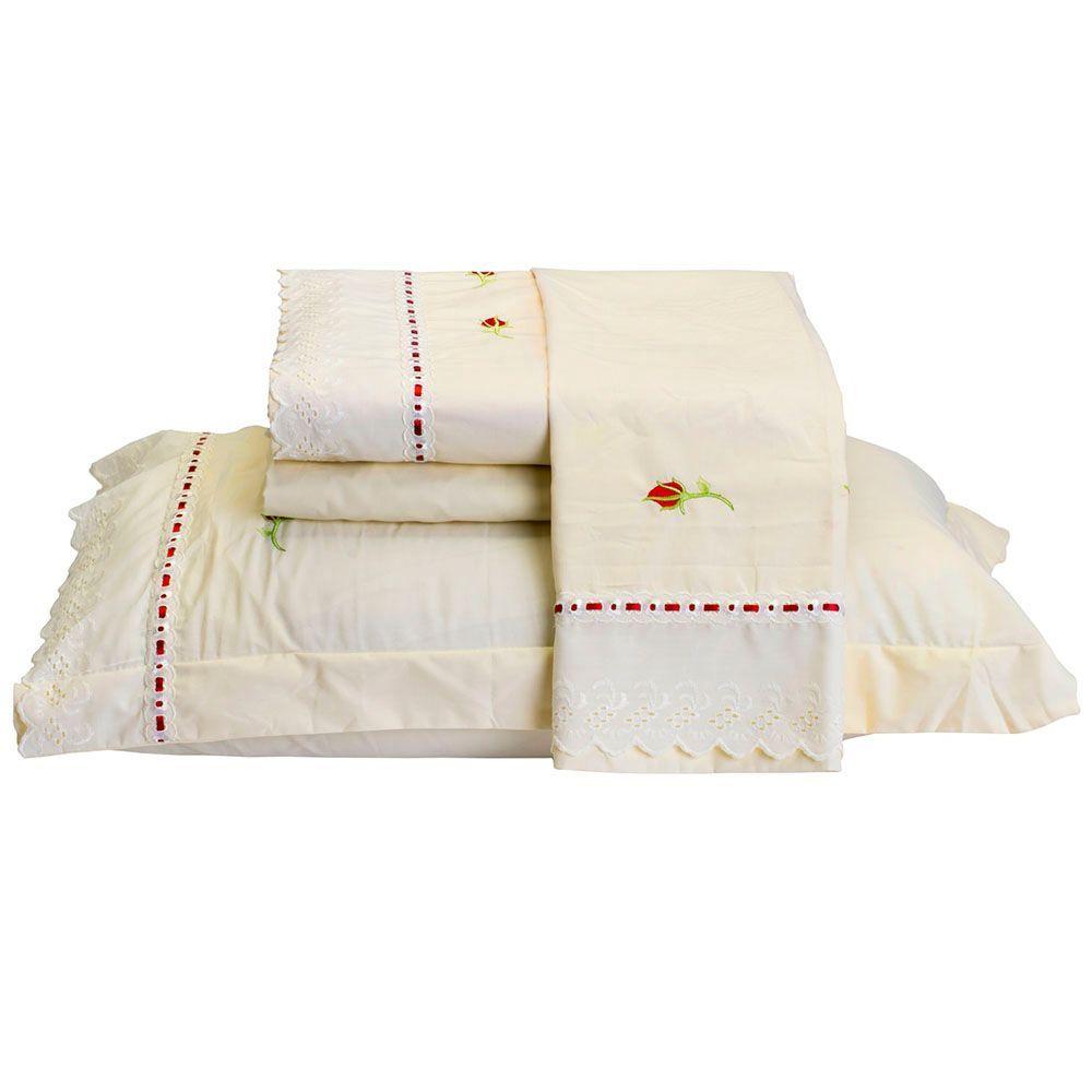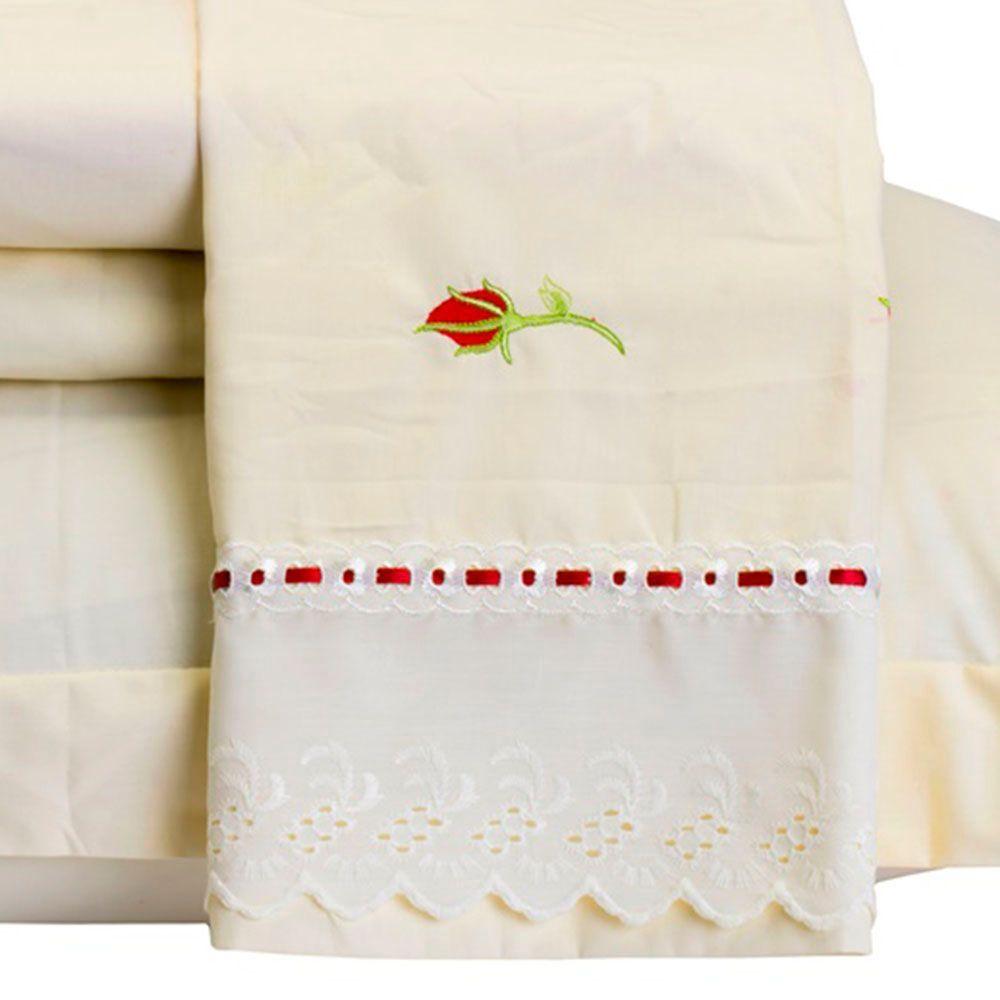 Jogo De Lençol Yasmin Queen 4 Peças Percal 200 Fios 100% Algodão Bordado Floral - Palha