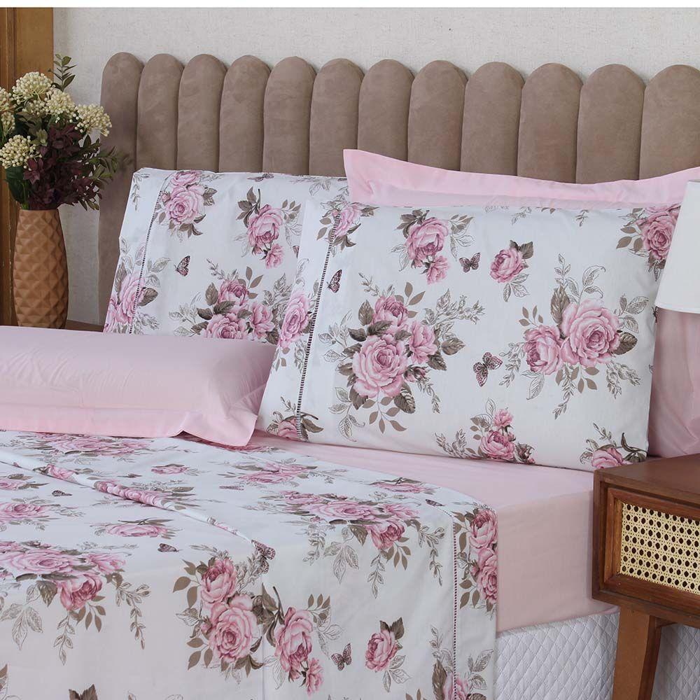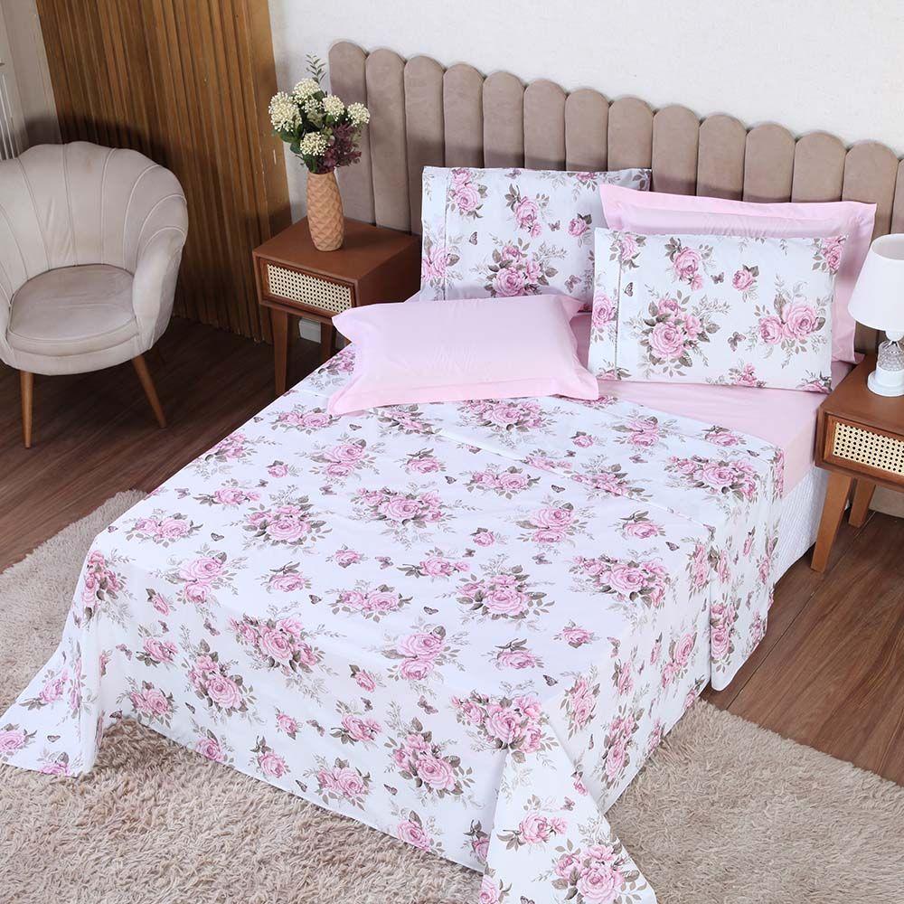Jogo De Lençol Beatriz Solteiro 3 Peças Percal 180 Fios 100% Algodão Ponto Palito - Rosa Floral