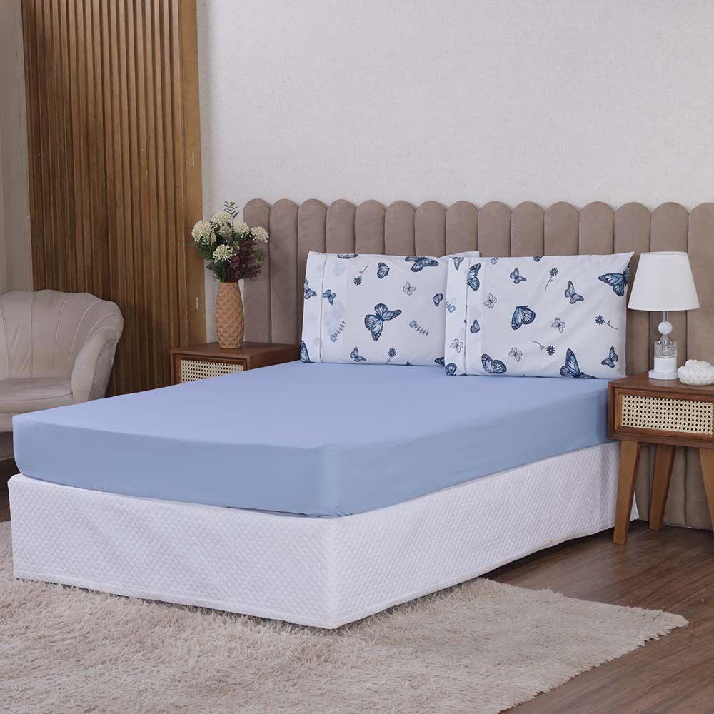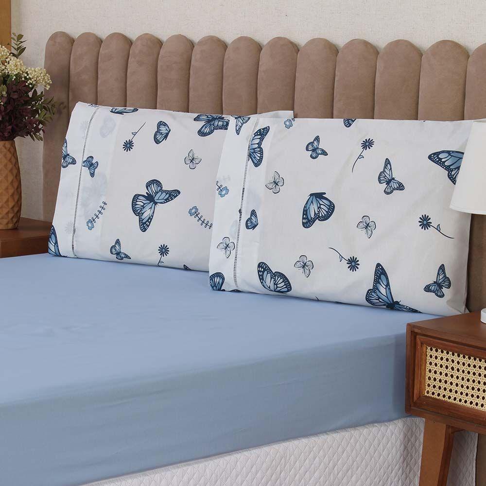 Jogo De Lençol Beatriz King 3 Peças Percal 180 Fios 100% Algodão Ponto Palito - Azul Borboleta