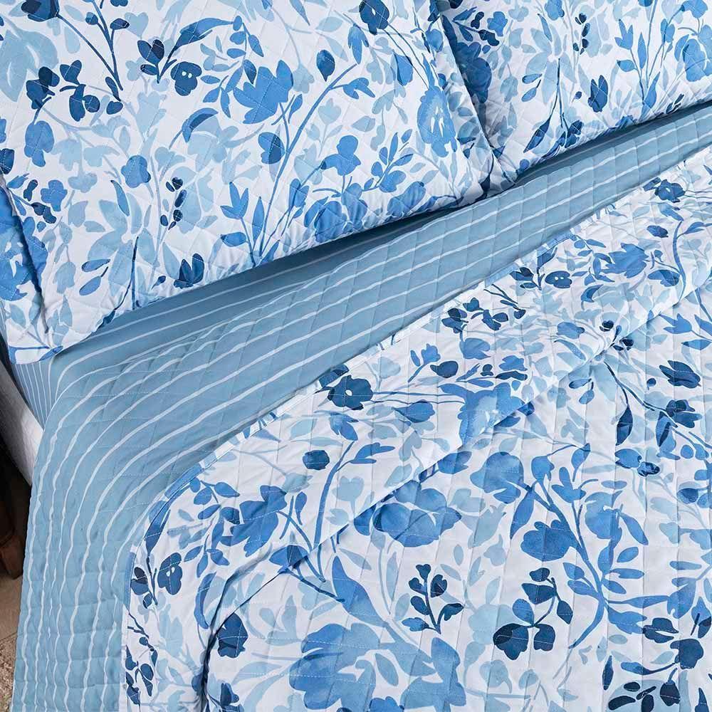 Kit Cobre Leito Colcha Benim Queen 3 Peças Dupla Face Micropercal 400 Fios - Loli Azul Floral - 100% Poliéster