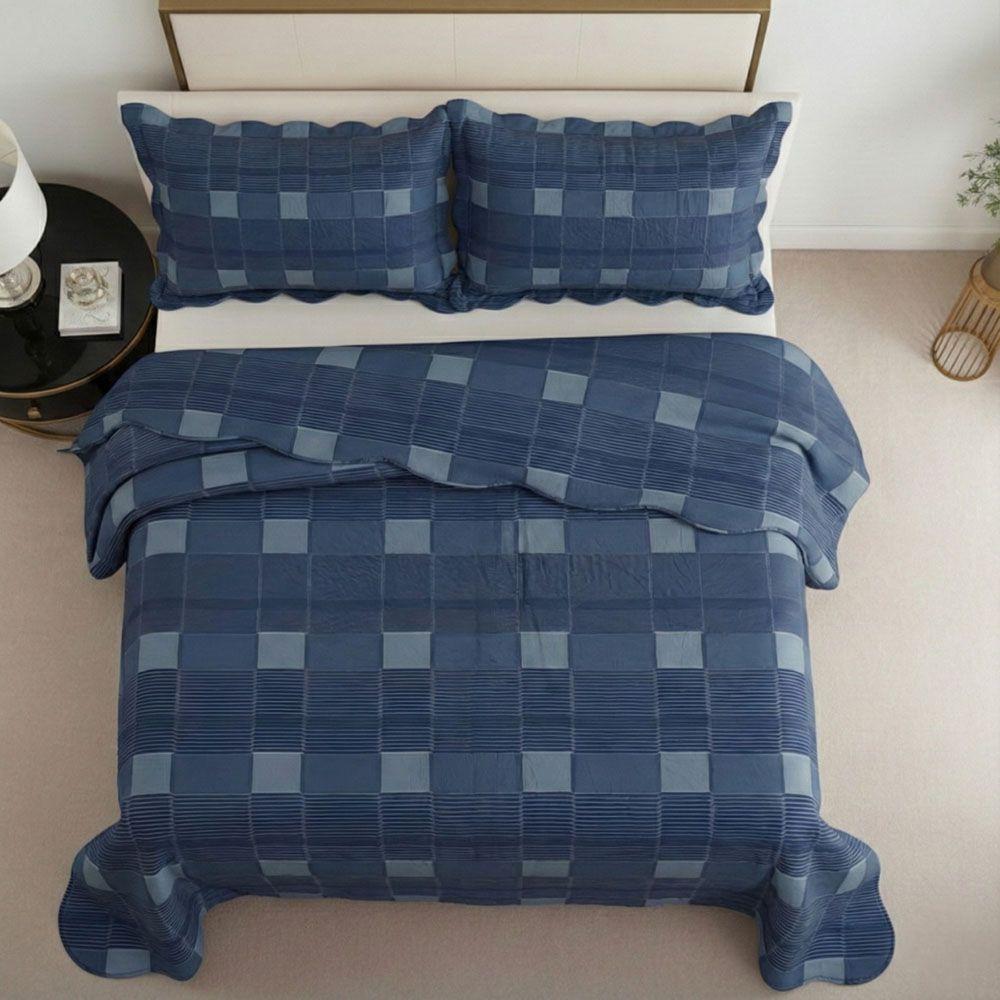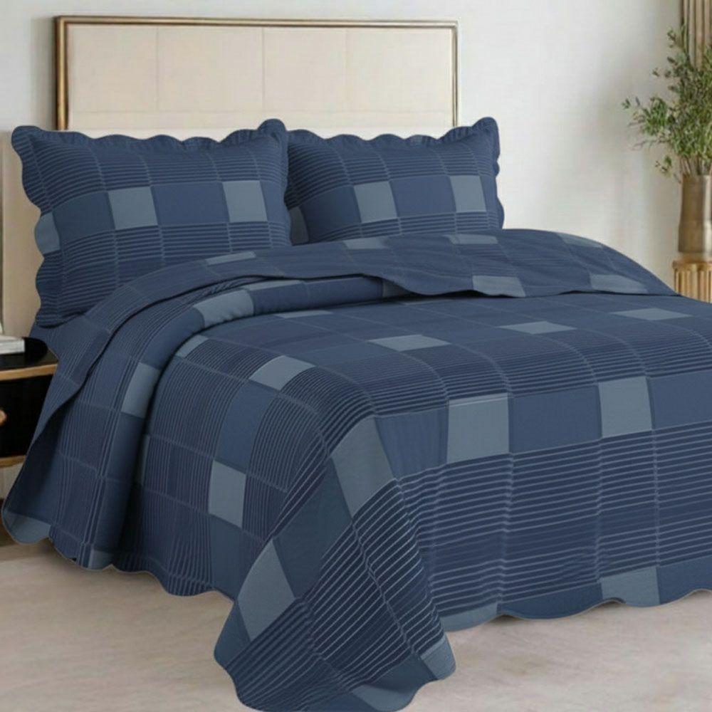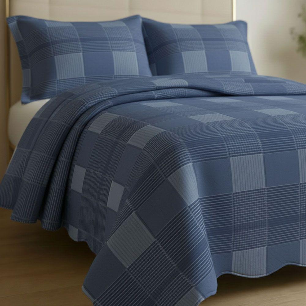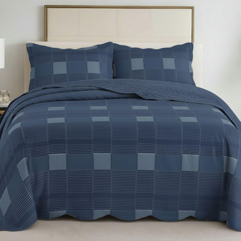Kit Cobre Leito Colcha Magnus Queen 3 Peças Dupla Face Estampado Geométrico - Xadrez Marinho - 100% Poliéster