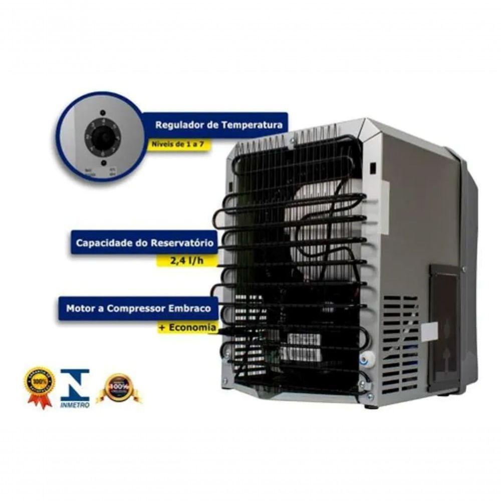 Purificador Água Alcalina Ionizada Ozônio E Magnésio Mg+ Cinza 110VVOLTAGEM 127VCOR CINZAO Purificador de Água Alcalina Ionizada Ozônio e Magnésio Mg+ é um equipamento completo que une as tecnologias de filtragem, alcalinização, ionização, ozonização e mineralização da água.Ele eleva o pH para níveis alcalinos (entre 8,0 e 9,5), adiciona magnésio (Mg) e oferece água purificada, livre de impurezas e refrigerada.Sua carcaça metálica na cor cinza e o funcionamento em 127 V tornam-no ideal para uso residencial ou comercial, oferecendo alto desempenho e design moderno.Principais funcionalidades e benefíciosÁgua alcalina: auxilia na hidratação e no equilíbrio do pH corporal.Enriquecimento com magnésio: adiciona um mineral essencial que favorece o metabolismo, o sistema nervoso e os músculos.Ionização: reorganiza as moléculas de água, tornando a absorção pelo organismo mais eficiente.Função ozônio: promove desinfecção profunda da água, eliminando micro-organismos e podendo ser usada na higienização de frutas, verduras e utensílios.Refrigeração eficiente: mantém água gelada constantemente, com baixo consumo de energia.Design robusto e elegante: estrutura em aço, conferindo durabilidade e aparência sofisticada.Etapas de purificaçãoO purificador Top Life realiza um processo de 9 etapas de filtragem e purificação, garantindo qualidade superior da água:Filtragem inicial com polipropileno (25 micra): retém partículas sólidas como areia, barro e ferrugem.Carvão ativado com prata coloidal: reduz cloro, odores e compostos orgânicos, com ação bacteriostática.Manta e tela texturizada: retém pequenas partículas e melhora o sabor da água.Camada mineral Zeolife: remove metais pesados e impurezas químicas, preservando minerais benéficos.Carvão ativado vegetal (casca de coco): aprimora o sabor e elimina resíduos orgânicos.Alcalinização: eleva o pH da água para níveis entre 8,5 e 9,5.Ionização: reorganiza as moléculas de água, tornando-as mais leves e fáceis de absorver.Ozonização: injeta ozônio na água, eliminando bactérias e micro-organismos.Enriquecimento com magnésio (Mg): adiciona o mineral essencial de forma gradual.Especificações técnicasTipo: Purificador refrigerado, alcalino, ionizado, com ozônio e magnésio.Voltagem: 127 VPotência: 100 WAmperagem: 0,78 AConsumo de energia: cerca de 2,3 kWh/mêsCapacidade de refrigeração: 2,4 litros/hora (em temperatura ambiente de 32 °C)Vazão máxima: 45 a 60 litros/horaVida útil do refil: 3.000 litros ou até 12 meses de usoMaterial: corpo metálico em aço de alta durabilidadePeso líquido: 11,8 kgDimensões (sem embalagem): 29 cm (largura) × 38,6 cm (altura) × 39,4 cm (profundidade)Dimensões (com embalagem): 44 cm × 35 cm × 42,5 cmCompatibilidade e instalaçãoPode ser instalado sobre bancadas, pias ou paredes, conforme o ambiente.Indicado para uso residencial ou comercial.Necessita de ponto de água com pressão adequada e tomada compatível com 127 V.Compatível com refis originais Top Life Alcalino Mg+, garantindo o mesmo nível de purificação.Observações e recomendaçõesVerifique a voltagem antes da instalação para evitar danos ao equipamento.Realize a troca do refil a cada 12 meses ou quando atingir 3.000 litros de uso.A função ozônio deve ser usada de acordo com o manual, especialmente em ambientes fechados.Mantenha o aparelho em local ventilado e de fácil acesso para manutenção.Embora a água alcalina e ionizada traga benefícios relatados, pessoas com condições médicas específicas devem consultar um profissional de saúde antes do consumo prolongado.VOLTAGEM 127VCOR CINZAO Purificador de Água Alcalina Ionizada Ozônio e Magnésio Mg+ é um equipamento completo que une as tecnologias de filtragem, alcalinização, ionização, ozonização e mineralização da água.Ele eleva o pH para níveis alcalinos (entre 8,0 e 9,5), adiciona magnésio (Mg) e oferece água purificada, livre de impurezas e refrigerada.Sua carcaça metálica na cor cinza e o funcionamento em 127 V tornam-no ideal para uso residencial ou comercial, oferecendo alto desempenho e design moderno.Principais funcionalidades e benefíciosÁgua alcalina: auxilia na hidratação e no equilíbrio do pH corporal.Enriquecimento com magnésio: adiciona um mineral essencial que favorece o metabolismo, o sistema nervoso e os músculos.Ionização: reorganiza as moléculas de água, tornando a absorção pelo organismo mais eficiente.Função ozônio: promove desinfecção profunda da água, eliminando micro-organismos e podendo ser usada na higienização de frutas, verduras e utensílios.Refrigeração eficiente: mantém água gelada constantemente, com baixo consumo de energia.Design robusto e elegante: estrutura em aço, conferindo durabilidade e aparência sofisticada.Etapas de purificaçãoO purificador Top Life realiza um processo de 9 etapas de filtragem e purificação, garantindo qualidade superior da água:Filtragem inicial com polipropileno (25 micra): retém partículas sólidas como areia, barro e ferrugem.Carvão ativado com prata coloidal: reduz cloro, odores e compostos orgânicos, com ação bacteriostática.Manta e tela texturizada: retém pequenas partículas e melhora o sabor da água.Camada mineral Zeolife: remove metais pesados e impurezas químicas, preservando minerais benéficos.Carvão ativado vegetal (casca de coco): aprimora o sabor e elimina resíduos orgânicos.Alcalinização: eleva o pH da água para níveis entre 8,5 e 9,5.Ionização: reorganiza as moléculas de água, tornando-as mais leves e fáceis de absorver.Ozonização: injeta ozônio na água, eliminando bactérias e micro-organismos.Enriquecimento com magnésio (Mg): adiciona o mineral essencial de forma gradual.Especificações técnicasTipo: Purificador refrigerado, alcalino, ionizado, com ozônio e magnésio.Voltagem: 127 VPotência: 100 WAmperagem: 0,78 AConsumo de energia: cerca de 2,3 kWh/m