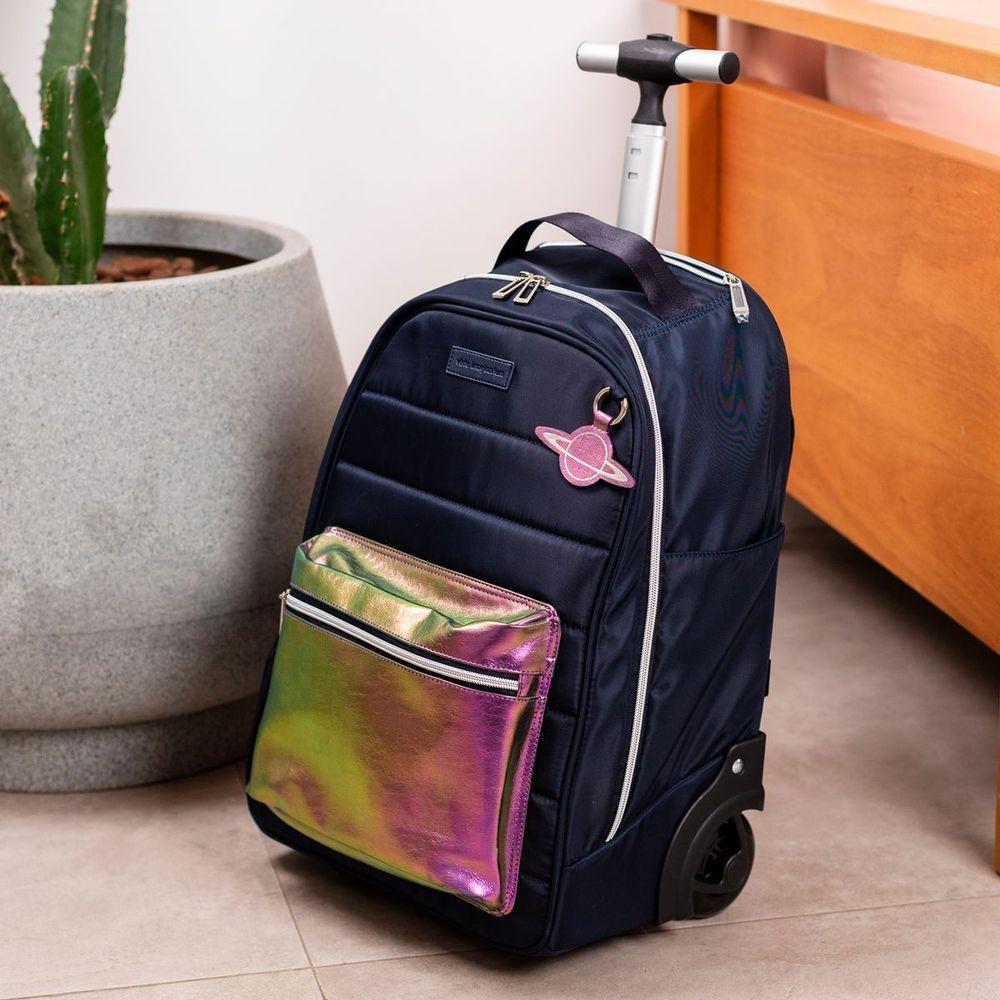 Mochila De Rodinhas Galaxia MarinhoCom uma beleza de outro planeta, nossa Mochila de Rodinhas Galáxia Marinho chegou para agilizar a sua rotina com a velocidade de um cometa!Toda em azul-marinho e contando com detalhes em lilás com efeito furta-cor, em sua parte externa, ela traz: 1 bolsão frontal com zíper, 2 bolsos laterais, 1 chaveiro em formato de planeta, 1 alça de mão, 1 puxador de rodinhas e 2 alças de ombro com ganchos nas extremidades, caso você queira guardá-las no compartimento para alças.Já em sua parte interna, ela traz 1 compartimento para um laptop de até 14 e bastante espaço para você organizar os seus itens no dia a dia.Contém 1 mochila e 1 acessório.Não podem ser vendidos separadamente.Tecido: 100% poliéster.Ferragens: zinco.Acessório e bolso frontal: 60% poliuretano e 40% poliéster.Detalhes: alumínio.Capacidade máxima: 10 kg.Compartimento para laptop de até 14.Medidas: Profundidade 23 cm x Largura 32 cm x Altura 45 cm.Limpar com pano levemente umedecido nas áreas sujas.Teme químicos e abrasivos.Validade indeterminada.Referência - PI6393YFunção - MOCHILAS DIA A DIAExclusivo - IMAGINARIUM