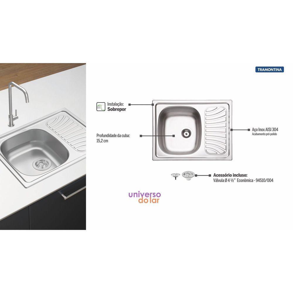 Cuba De Sobrepor Tramontina Alpha 34 R Aço InoxCuba de Sobrepor Tramontina Alpha 34 R Aço Inox -Cuba de Sobrepor Tramontina Alpha em Aço Inox com Acabamento Pré Polido 62 x 50 cm com Escorredor e VálvulaSe você procura por um produto versátil, a Cuba de Sobrepor Tramontina Alpha em Aço Inox com Acabamento Pré Polido 62 x 50 cm com Escorredor e Válvula da linha Perfecta é a escolha certa. Um item que agregará facilmente ao seu projeto, oferecendo ainda mais beleza para o ambiente.Além disso, você poderá contar com toda a qualidade que só a Tramontina oferece, pois a Cuba de Soprepor, que conta com 15,2 cm de profundidade, é produzida em Aço Inox 304, com 0,6 mm de espessura e acabamento pré-polido, garantindo a sua durabilidade e resistência.Descrição TécnicaInstalação: SobreporCuba: SimplesMaterial:- Aço Inox AISI 304- Espessura: 0,6 mmAcabamento: Pré-polidoProfundidade da cuba: 15,2 cmFuro para torneira: NãoAcessórios inclusos:- Kit de instalação- 1 Válvula Ø 4 1/2Nicho para instalação: Verificar folhetoOrientação GeralRemover a etiqueta colada.Esta peça contém bordas cortantes. Manusear com cuidado.Não usar ácido muriático, água sanitária ou qualquer outro solvente para lavar objetos na Cuba de sobrepor .Na reforma ou construção, proteger para não deixar sobre a mesma pó de cimento ou gesso.Enxaguar e secar bem a peça após o uso.Nunca deixar objetos metálicos sobre a peça por períodos muito longos, para evitar a corrosão.Para manter o brilho, recomenda-se o uso da pasta para polir e remover manchas em superfícies deaço inoxidável Tramontina.Características Gerais do Produto: - Cor: InoxAcompanha o produto: - Acompanha 94510004 Válvula Tramontina Econômica para Pias e Cubas 4 1/2 em Aço Inox Garantia: - 10 Anos