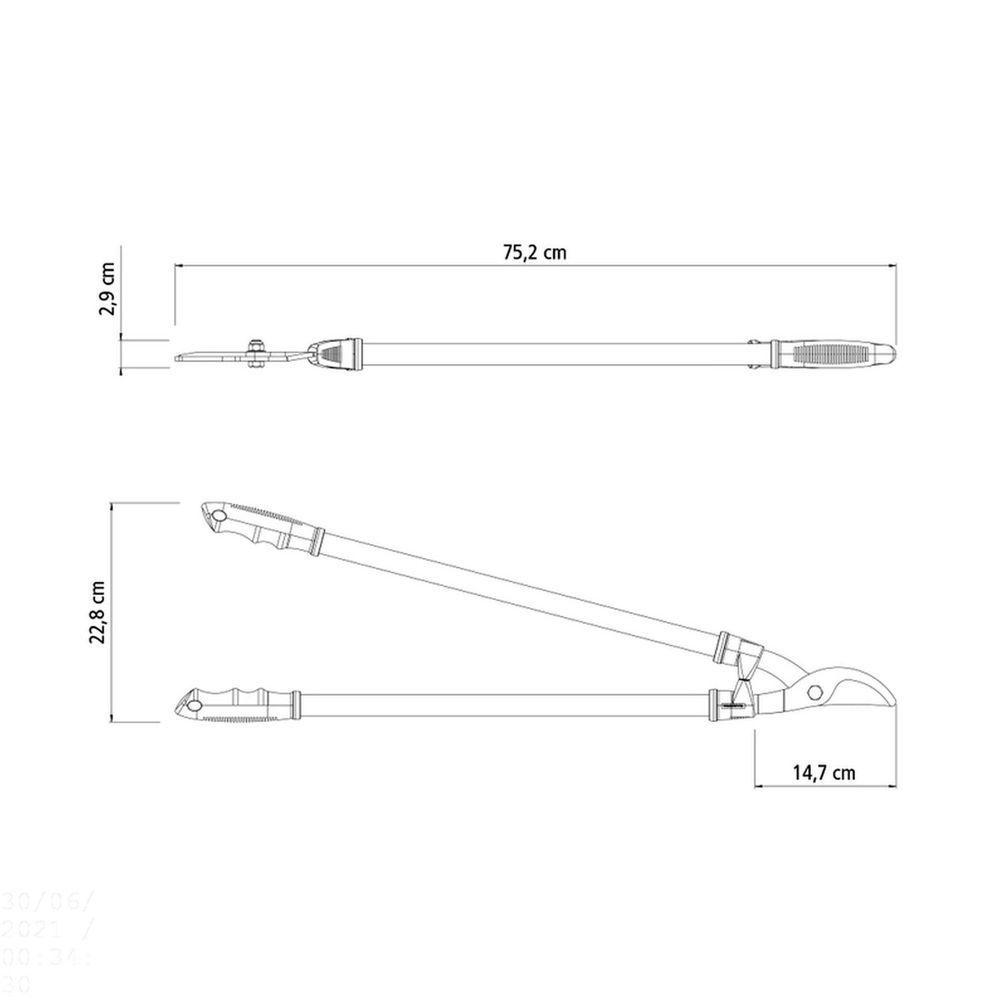 Tesourão De Poda Tipo Bypass Tramontina Em Aço Com Cabo Metálico 60 Cm TramontinaTesourão de Poda Tipo Bypass Tramontina em Aço com Cabo Metálico 60 cm Tramontina -Tenha mais facilidade ao podar suas árvores e arbustos com o tesourão de poda tipo bypass Tramontina em aço com cabo metálico 60 cm! Perfeito para a poda de galhos duros ou grossos, o tesourão possui lâminas que se transpassam, tipo bypass, fazendo dele uma ferramenta perfeita, que deixa o corte de galhos verdes muito mais prático. A extensão do seu cabo metálico tem 60 centímetros e auxilia o alcance à galhos de difícil acesso. Garanta o seu e tenha seu jardim sempre bem cuidado com Tramontina!Orientações- Lâminas em aço carbono temperado para um corte preciso e macio.- Cabos metálicos 60 cm com empunhadura.- Empunhaduras ergonômicas.- Batente plástico.- Eficiente para galhos com diâmetro até 30 mm.- Tecnologia Bypass (corte cruzado). Indicado para galhos verdes. Durante o corte, ocorre o cruzamento entre lâmina e contra-lâmina. Possibilita um corte preciso e sem rebarbas, que não deixa marcas no galho e facilita a cicatrização.Características GeraisEAN137891117030263DUN1417891117030260NCM8201.60.00Peso Líquido1,3490 kg.Peso Bruto1,4470 kg.Metragem0,006813 m³.Dimensões Embalagem (Compr. X Larg. X Alt.)830x 225x 33 mm.Dimensões Produto (Compr. X Larg. X Alt.)752x 228x 29 mm.Cor 1FFA500 HexaObservações- Destinada a poda de galhos mais grossos ou duros e galhos altos ou de difícil acesso.- Técnica adequada de poda: O corte deve ser limpo, a 6 mm da união do brote.- Conservar a ferramenta limpa, secando-a depois de lavá-la. Aplique fina camada de óleo sobre as lâminas e articulações.- Cuidado: A lâmina é afiada. O contato pode resultar lesões. Manuseie com cuidado e mantenha fora de alcançe das crianças.- Para descarte dos produtos e embalagens siga as orientações de reciclagem vigentes.Características Gerais do Produto:Garantia: - 1 Ano