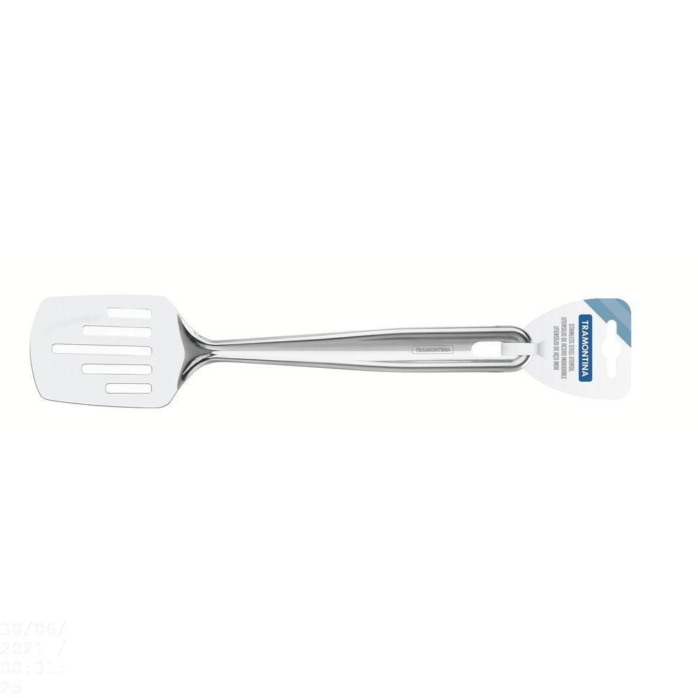 Espátula Tramontina Extrata Perfurada Em Aço Inox TramontinaEspátula Tramontina Extrata Perfurada em Aço Inox Tramontina -Com a Espátula Tramontina Perfurada em Aço Inox Acabamento Brilho da linha Extrata você poderá realizar os mais diferentes tipos de preparo com facilidade. Além disso, ela é produzida completamente em aço inox, proporcionando durabilidade, resistência e beleza para a sua cozinha. Seu furo no cabo permite que você possa incluí-la na decoração com sofisticação e praticidade.OrientaçõesTotalmente feita de aço inox, por isso não solta nenhum resíduo nos alimentos, mantendo-os saudáveis.Altamente durável, mantém suas características, preservando a beleza, a higiene e a durabilidade do material.Possui furo no cabo, o que permite incluí-la na decoração da cozinha.Pode ser lavada diariamente na máquina de lavar louças.Características GeraisEAN137891116115633DUN1417891116115630NCM8215.99.10Peso Líquido0,1057 kg.Peso Bruto0,1110 kg.Metragem0,000942 m³.Dimensões Embalagem (Compr. X Larg. X Alt.)76x 40x 310 mm.Dimensões Produto (Compr. X Larg. X Alt.)310x 76x 40 mm.Espessura1,2 mm.ObservaçõesDurante a lavagem, use apenas sabão ou detergente e uma esponja macia. Outros tipos de produtos, como palha de aço, poderão riscar ou prejudicar o brilho dos talheres.Enxágue bem cada peça a fim de remover totalmente os resíduos dos produtos de limpeza, pois, por serem abrasivos, podem prejudicar o inox.Sempre que possível, use água quente, pois renova o brilho do talher.Após a lavagem, enxugue imediatamente os talheres, caso contrário, as substâncias químicas da água (cloro) poderão ca manchas.Evite atrito entre os talheres durante o processo de lavagem e no armazenamento, para mantê-los sem riscos.Evite o contato das peças com superfícies quentes. Elas provocam a descoloração do produto.Não guarde os talheres em locais úmidos. A umidade também provoca manchas.Ao a lava-louça, recomendamos retirar os talheres logo que tenha terminado o ciclo enxaguar, a fim de que sejam secados manualmente.Características Gerais do Produto:Garantia: - 1 Ano