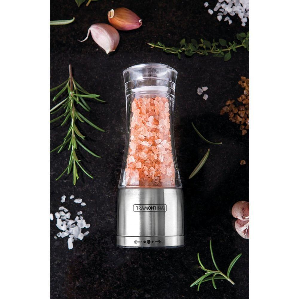 Moedor Tramontina Realce Para Sal Ou Pimenta Em Acrílico E Aço Inox Com Moinho Em Cerâmica TramontinaMoedor Tramontina Realce para Sal ou Pimenta em Acrílico e Aço Inox com Moinho em Cerâmica Tramontina -Com este Moedor Tramontina Sal ou Pimenta em Acrílico e Aço Inox com Moinho em Cerâmica, ficou muito mais prático temperar seus alimentos. Com design elegante, possui engrenagens de alta resistência e durabilidade. Tem regularem do tamanho do grão para você usar na medida certa.Prático e elegante!Possui engrenagens de alta resistência, proporcionando maior durabilidade.Com ajuste de moagem, possui regulador de tamanho de grão, para que seja ajustado conforme seu gosto.Garantindo higiene e beleza.Material: acrílico + aço inox.Moedores de cerâmica.Compartimento de acrílico.Tampa de acrílico.Capacidade:Sal = 150 GPimenta = 75 GObservaçõesPara regular o tamanho do grão:Com uma das mãos segure a base e com a outra gire o suporte de regulagem, verificando a ilustração da marcação no suporte de regulagem para o tamanho do grão que desejar (sentido horário, moagem mais grossa; sentido anti-horário, moagem mais fina).Para abastecer:Remova a tampa do compartimento e adicione o sal grosso ou a pimenta. Após, recoloque a tampa.Para moer:Posicione o moedor de cabeça para baixo. Com uma das mãos segure a base e com a outra gire o compartimento no sentido horário, para moer o tempero.USO SEGURO E ADEQUADO:Tenha cuidado ao manusear o produto, poderá quebrar ao sofrer quedas ou impactos.Ao usar o moedor com sal em ambientes muito úmidos, ele poderá não funcionar adequadamente; recomendamos trocar ou secar o sal.Não lavar o moedor; para limpeza, use um pano úmido na parte externa.Para descarte dos produtos e embalagens, siga as orientações de reciclagem vigentes.Características GeraisEAN137891116110829DUN1417891116110826NCM8210.00.10Peso Líquido0,2090 kg.Peso Bruto0,2750 kg.Metragem0,001013 m³.Dimensões Embalagem (Compr. X Larg. X Alt.)185x 74x 74 mm.Dimensões Produto (Compr. X Larg. X Alt.)65x 65x 167 mm.Características Gerais do Produto:Garantia: - 1 Ano