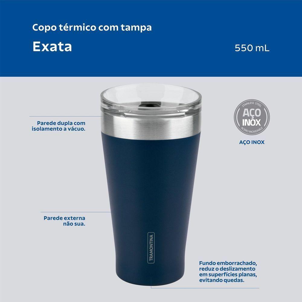 Copo Térmico Tramontina Exata Em Aço Inox Azul Com Tampa 550 Ml TramontinaCopo Térmico Tramontina Exata em Aço Inox Azul com Tampa 550 ml Tramontina -Copo Térmico Tramontina Exata em Aço Inox Azul com Tampa 550 mlSua rotina fica muito mais prática, com o copo térmico Tramontina Exata em aço inox com parede dupla azul com tampa 550 ml. Ideal para levar seu café, chá ou vitamina para os compromissos, ele é produzido em aço inox com parede dupla e isolamento a vácuo, que mantém suas bebidas na temperatura ideal por muito mais tempo. Ele é livre de BPA, não mancha e não retém odores, além de vir acompanhado de tampa com abertura e acabamento de silicone que facilita a vedação. Escolha sua bebida preferida e aproveite seu dia a dia na companhia da Tramontina!Os copos Térmicos inox Tramontina são feitos em parede dupla de aço inox com isolamento a vácuo para manter as bebidas frias ou quentes por mais tempo.Aproveite seu chá ou seu café quente, drink favorito ou bebida gelada até o fim. Livre de BPA.Fácil de lavar, não mancha, não quebra e não retém odores.A parede dupla, além de conservar a temperatura evita que a parede externa aqueça com bebidas quentes ou sue com bebidas geladas.Compatível com a maioria dos porta copos.Uso recomendado tanto para adultos quanto para crianças acima de 3 anos.Produto reutilizável.Acompanha tampa, possui abertura para beber sem precisar abrir o copo. A tampa contém um acabamento de silicone que facilita a vedação. O copo térmico com tampa é ideal para consumir sua bebida favorita em movimento, caminhando ou no console do carro. A tampa evita respingos ou que o usuário derrame o líquido demasiadamente.Cuidados com o produto Não utilize produtos abrasivos, pois eles podem riscar o aço inoxidável. Lave somente com detergente neutro e esponja macia.Para evitar respingos, certifique-se de que a tampa está bem encaixada no copo. Use na vertical. Não guarde o produto molhado.Não utilize ebulidor elétrico para aquecimento.Não encha demasiado com líquidos quentes. Os líquidos quentes podem causar queimaduras.Evite utilizar leite e derivados, pois são produtos perecíveis e estes não devem permanecer por longos períodos fora de refrigeração.Para remover odores desagradáveis ou manchas persistentes, deixe o copo de molho em uma solução com água quente e bicarbonato de sódio.Dicas: Recomendamos aquecer ou refrigerar antecipadamente o copo antes de usar, para manter o líquido por mais tempo aquecido/frio.Garantia90 dias para vícios ou defeitos de fabricação.Características Gerais do Produto:Garantia: - 90 dias para vícios ou defeitos de fabricação.