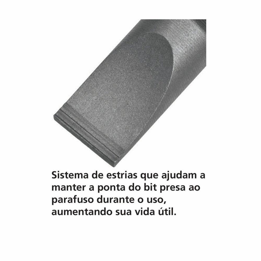 Ponteira Ponta Chata Mm Tramontina Pro TramontinaPonteira Ponta Chata mm Tramontina PRO Tramontina -Utilizados para apertar e afrouxar parafusos com resistência e . Verifique o encaixe ideal para o seu trabalho e mãos à obra.OrientaçõesAço ferramenta S2.Têmpera total.Acabamento fosfatizado.DIN 3127.Os dimensionais das pontas são verificados com gabaritos-padrão calibrados e certificados, e a qualidade do fosfato é inspecionada ao microscópio.Sistema de estrias que ajudam a manter a ponta do bit presa ao parafuso durante o uso, aumentando sua vida útil.Utilizados para apertar ou afrouxar parafusos de fenda simples.Ideal para utilização em parafusadeiras com encaixe de 1/4.As ferramentas são produzidas e testadas conforme normas específicas.ObservaçõesUse óculos, luvas e outros equipamentos de proteção individual (EPIs) de acordo com a tarefa a ser executada.Utilize chaves de fenda isoladas, identificadas pela marcação V, quando for necessário trabalhar em locais com corrente elétrica. Importante: nestes casos, inspecione a integridade da isolação elétrica, e, se aparecerem trincas na isolação, suspenda o uso imediatamente.Utilize chaves com ponta adequada para cada tipo de fenda, para realizar a tarefa de forma mais rápida e segura.Respeite o torque estabelecido por norma para cada bitola.Não utilize as chaves de fenda como formão ou alavanca.Não altere as dimensões da ponta para obter outro perfil.Armazene em limpo e seco.Características Líquido0,0500 Bruto0,0600 kg.Metragem0,000009 m³.Dimensões Embalagem (Compr. X Larg. X 30x 10 ões Produto (Compr. X Larg. X 7x 7 ão Extra A4,5 ão Extra B50,0 ão Extra C6,3 ão Extra D7,2 ão Extra E0,6 mm.Características Gerais do Produto:Garantia:- 1 Ano