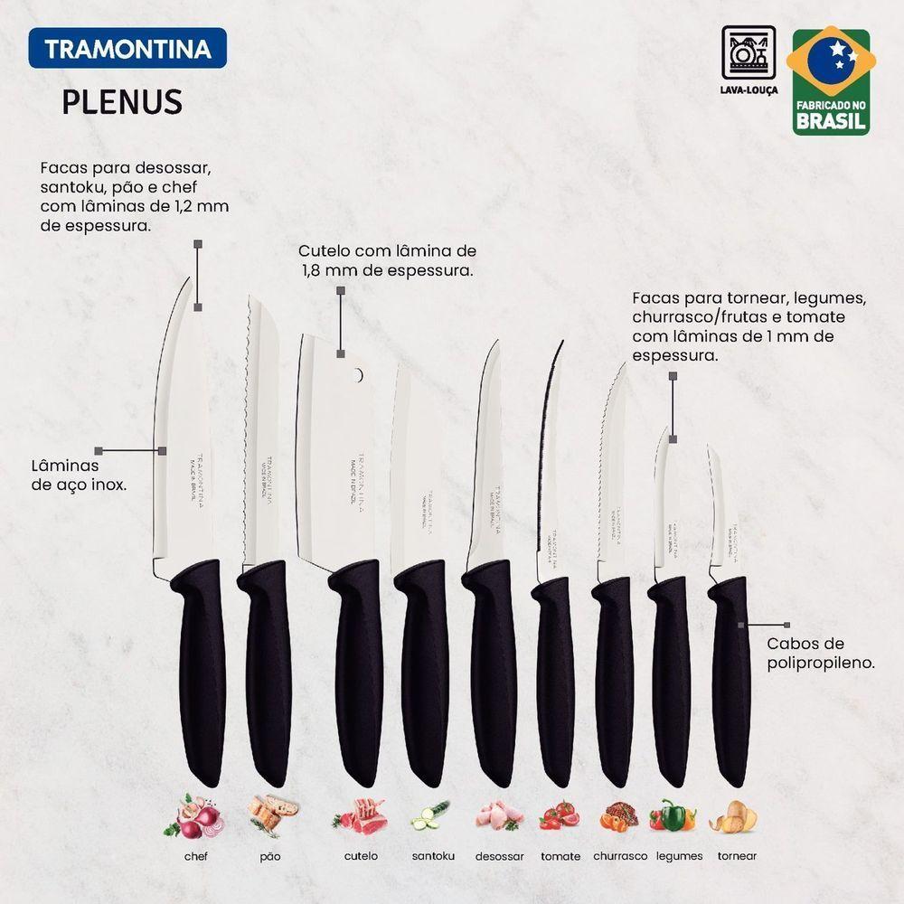 Jogo De Facas Tramontina Plenus Com Lâminas Em Aço Inox E Cabos De Polipropileno Preto 9 Peças TramontinaJogo de Facas Tramontina Plenus com Lâminas em Aço Inox e Cabos de Polipropileno Preto 9 Peças Tramontina -Jogo de Facas Tramontina Plenus com Lâminas em Aço Inox e Cabos de Polipropileno Preto 9 PeçasCom o jogo de facas Tramontina Plenus com lâminas em aço inox e cabos de polipropileno preto 9 peças, você terá a solução completa de facas para utilizar nos mais diversos tipos de cortes e ocasiões gastronômicas. As peças combinam com qualquer cozinha e a deixam mais bonita e clássica, pois seus cabos são na elegante cor preta. As lâminas produzidas em aço inox por terem sido submetidas a tratamento térmico, oferecem maior durabilidade e resistência. Elas são fáceis de limpar e podem ser lavadas na máquina de lavar louças. Com peças únicas e de muita importância na cozinha, o jogo de facas é a escolha perfeita para você. Facas de qualidade e beleza você encontra com a Tramontina!Características Gerais do Produto:Garantia: - 3 Meses