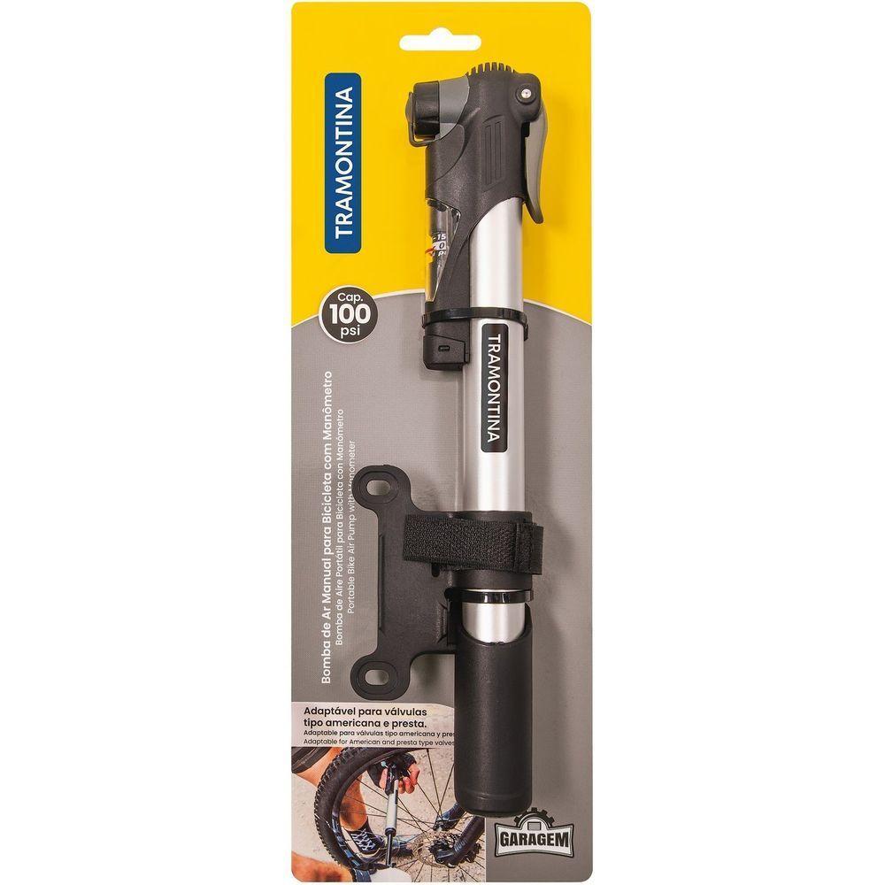 Bomba De Ar Portátil Tramontina Para Bicicleta Com Manômetro 100 Psi - 7 Bar TramontinaBomba de Ar Portátil Tramontina para Bicicleta com Manômetro 100 psi - 7 bar Tramontina -A Bomba de Ar Portátil Tramontina para Bicicletas com Manômetro 100 Psi é a melhor companheira para sua bicicleta. Projetada para encher pneus de forma eficaz e prática, ela pode estar presente na sua garagem e nos passeios ao ar livre, pois acompanha suporte e parafusos para fixação no quadro da bicicleta. Leve, possui corpo em alumínio que proporciona maior durabilidade ao produto. Seu manômetro possui duas escalas de pressão (bar e psi) e sua cabeça giratória facilita a visualização do manômetro e o enchimento dos pneus. É um item muito versátil, podendo ser utilizado com válvulas de bico fino (tipo Presta) e válvulas convencionais (tipo Americano).Características Gerais do Produto:Garantia: - Garantia total contra vícios ou defeitos de fabricação.