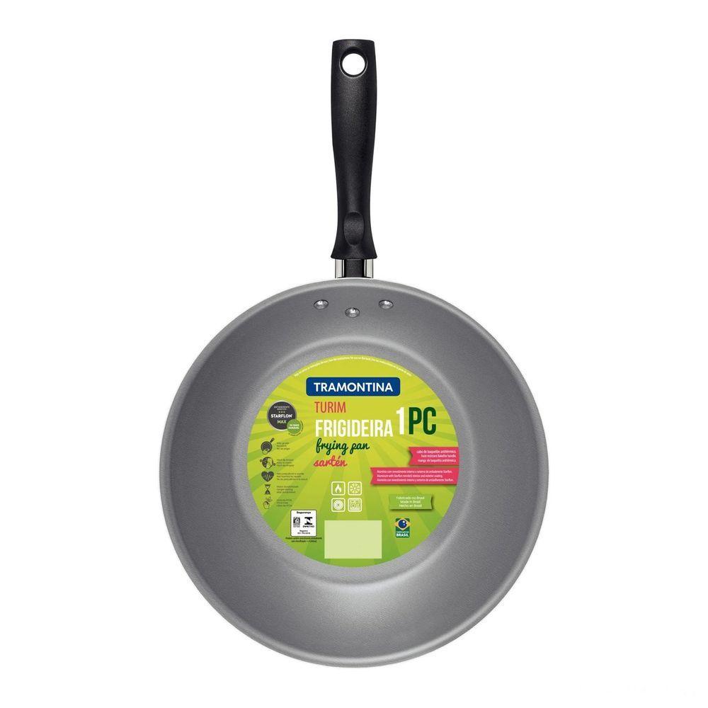 Frigideira Tramontina Turim Em Alumínio Antiaderente Starflon Max Chumbo 30cm 2,5l TramontinaFrigideira Tramontina Turim em Alumínio Antiaderente Starflon Max Chumbo 30cm 2,5L Tramontina -Frigideira Tramontina Turim em Alumínio com Revestimento Interno e Externo em Antiaderente Starflon Max Chumbo 30 cm 2,5 LUtilize a frigideira Tramontina Turim em alumínio com revestimento interno e externo em antiaderente Starflon Max chumbo 30 centímetros de diâmetro 2,5 litros em seu dia a dia e garanta maior praticidade para o preparo das suas refeições. Produzida em alumínio com espessura de 1,2 milímetros e revestimento interno e externo de antiaderente Starflon Max, ela garante o cozimento rápido e uniforme dos alimentos, evita que eles grudem em sua superfície, é muito fácil de limpar e mais durável. Para garantir sua segurança e conforto, o cabo é em baquelite, material antitérmico que não aquece. Uma frigideira eficiente, que pode ir à máquina de lavar louças e que vai otimizar sua rotina na cozinha!Corpo de alumínio com espessura de 1,2 mm que proporciona cozimento rápido e uniforme. Revestimento interno e externo de antiaderente Starflon Max que não gruda, é fácil de limpar, mais durável e não é prejudicial à saúde, pois é livre de PFOA.Cabo de baquelite antitérmico que oferece segurança durante o manuseio. Pode ir à máquina de lavar louças facilitando seu dia a dia.Cuidados com o produtoA capacidade volumétrica máxima para cozimento é de 3/4 da capacidade total da peça. Posicione o cabo do utensílio voltado ao centro do fogão. Em fogões com grade, centralize a peça sobre a chama ou fonte de calor e alinhe o cabo com a grade. Utensílios quentes devem estar fora do alcance das crianças.Antes do primeiro uso, lave com esponja macia, sabão neutro ou detergente líquido. Depois de secar, unte a área interna com óleo ou gordura e leve ao fogo por um ou dois minutos. Deixe esfriar e lave novamente.Seu utensílio Starflon está pronto para uso com ou sem gordura, sempre em fogo baixo ou médio (nunca superior a 260 °C). Para mexer os alimentos use somente utensílios de silicone, nylon ou madeira.Este produto não necessita de manutenção, apenas limpeza.Limpeza: Evite a imersão do utensílio quente em água fria.Nunca utilize produtos abrasivos na lavagem. Se deixar queimar alimentos, umedeça a área e reserve até que possa remover os resíduos grudados com esponja e sabão.Para descarte do produto e embalagem siga as orientações de reciclagem vigentes.Garantia ;90 dias para vícios ou defeitos de fabricação.Características Gerais do Produto:Garantia: - 3 meses Contra defeitos de fabricação
