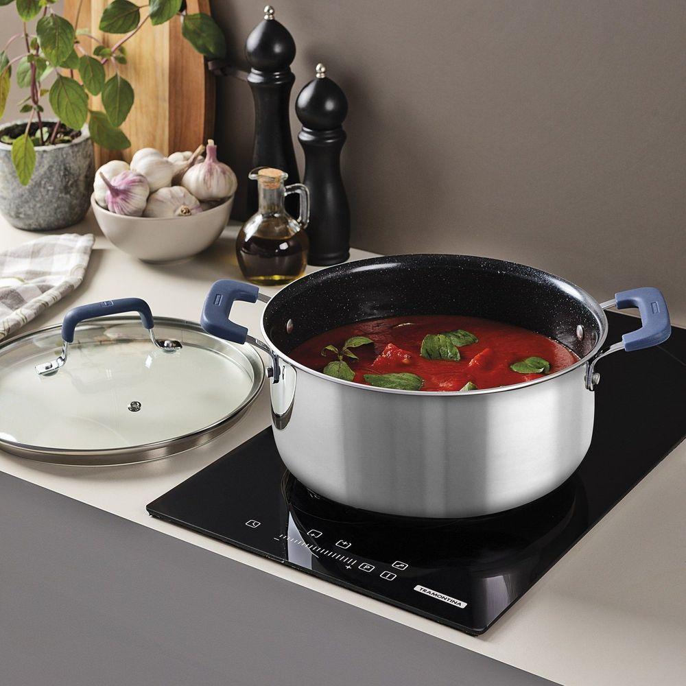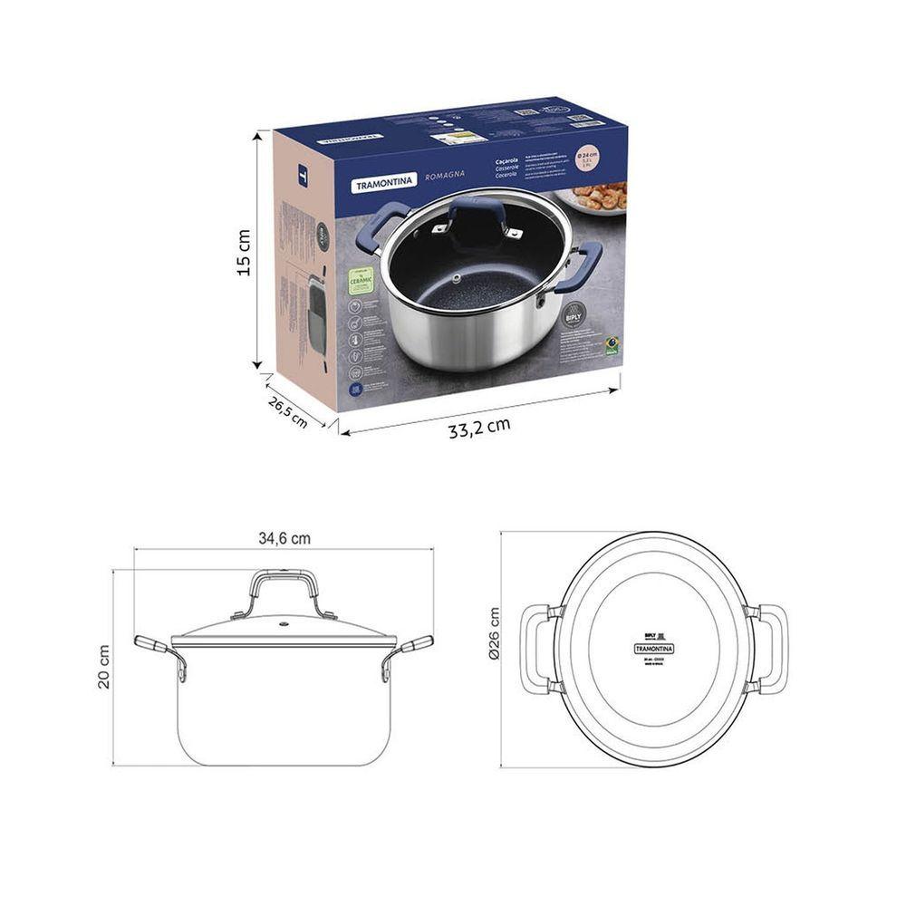 Caçarola Tramontina Romagna Em Aço Inox E Alumínio Cerâmico Black Stone 24 Cm 5,24 L TramontinaCaçarola Tramontina Romagna em Aço Inox e Alumínio Cerâmico Black Stone 24 cm 5,24 L Tramontina -Caçarola Tramontina Romagna em Aço Inox e Alumínio Cerâmico Black Stone 24 cm 5,24 LPara aprimorar suas criações culinárias, a caçarola Tramontina Romagna em aço inox e alumínio com revestimento interno cerâmico Black Stone de 24 centímetros de diâmetro é a escolha ideal para quem valoriza a qualidade na cozinha. Com seu revestimento interno em cerâmico ela proporciona um cozimento uniforme e preserva os sabores e nutrientes dos alimentos. Com a Tecnologia Biply Induction, que une em aço inox e alumínio, está caçarola proporciona uma distribuição de calor eficiente, permitindo que você cozinhe de maneira rápida e prática. As alças ergonômicas garantem um manuseio confortável e seguro, enquanto a tampa de vidro facilita o monitoramento do cozimento. Perfeita para preparar pratos que exigem atenção especial, a Linha Romagna combina funcionalidade e estilo, elevando o padrão da sua mesa.Corpo de aço inox + alumínio. Com espessura de 2,7 mm de alumínio e 0,6 mm de aço inox.Revestimento interno cerâmico.Tecnologia Biply: Dupla camada: durabilidade do aço inox + eficiência do alumínio. Aquecimento mais rápido e melhor desempenho na sua cozinha Seu utensílio resiste à máquina de lavar louças, embora diferentes detergentes para uso nestas máquinas podem ser mais agressivos e acelerar o desgaste de seu utensílio e reduzir as propriedades de antiaderência. Pode ser utilizada nos fogões: gás, elétrico, vitrocerâmico - resistência elétrica e indução.Cuidados com o produto O uso prolongado em temperaturas altas pode causar o amarelamento da superfície em aço inox. Para que a panela de aço inox fique sempre bonita e com brilho, recomendamos que seja lavada somente com detergente neutro e esponja. Nas partes foscas da panela pode-se utilizar o lado mais abrasivo da esponja com saponáceo líquido, para remover as manchas mais difíceis, ou ainda, pode ser usada a pasta para polimento e remoção de manchas da Tramontina.Depois da lavagem, enxágue a panela com água quente e seque-a imediatamente, para que ela mantenha o brilho original, pois o cloro e as substâncias contidas na água podem deixar manchas na panela.Garantia90 dias para vícios ou defeitos de fabricação - Produto com certificação compulsória certificada pelo OCP 0070 - SENAI, registro 014691/2024, modelo caçarola Romagna e classificação de antiaderência A (ótima), conforme portaria INMETRO 499/2021. -Características Gerais do Produto:Garantia: - 3 Meses
