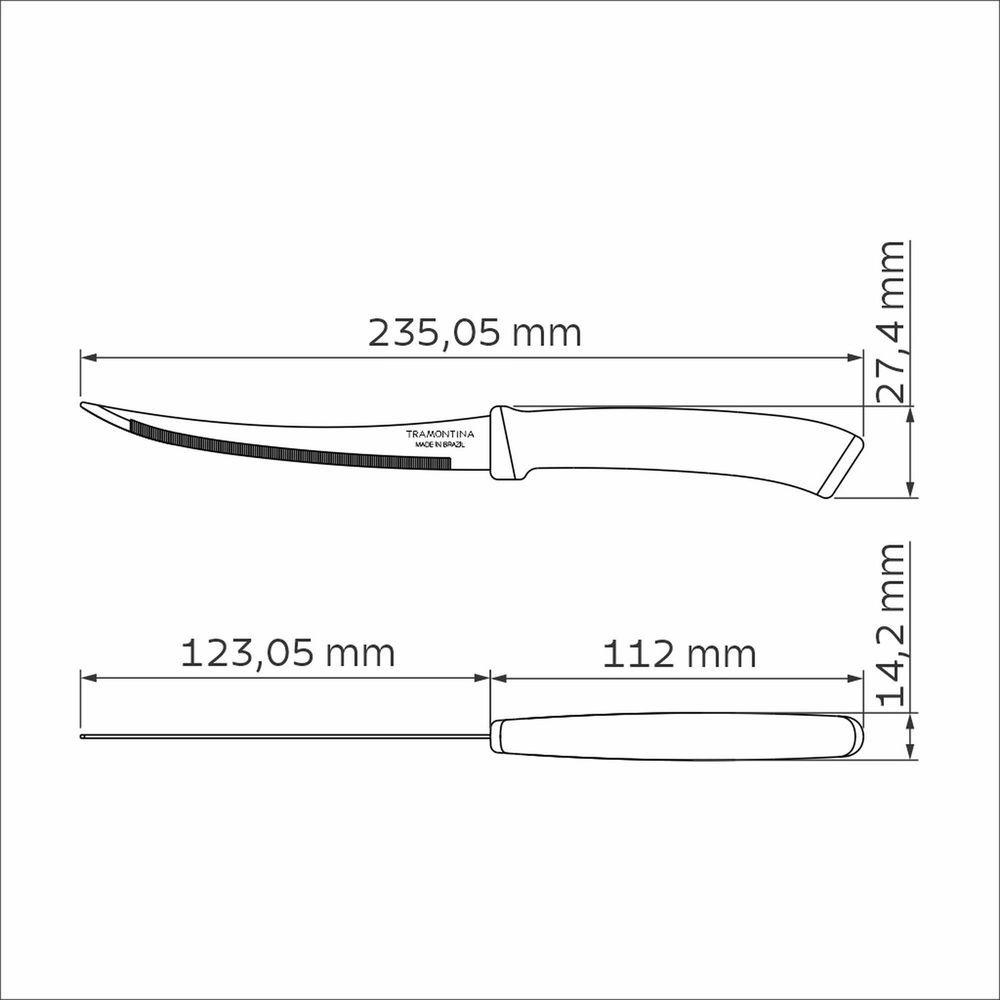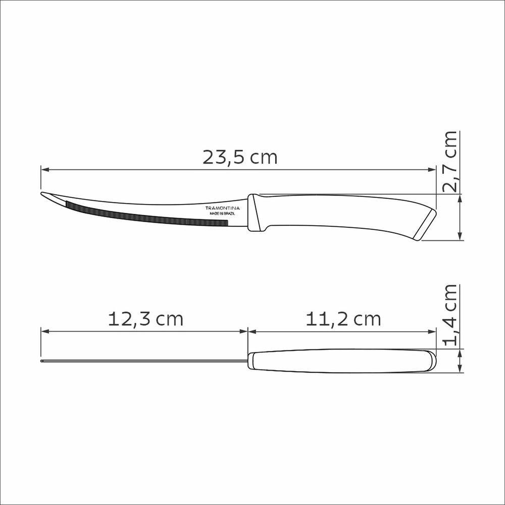 Faca Para Tomate Tramontina Felice Aço Inox Cabo De Polipropileno Azul 5 Polegadas TramontinaFaca para Tomate Tramontina Felice Aço Inox Cabo de Polipropileno Azul 5 polegadas Tramontina -Faca para Tomate Tramontina Felice Aço Inox Cabo de Polipropileno Azul 5 polegadasTenha cortes perfeitos de tomate com a faca para tomate Tramontina Felice com lâmina de aço inox e cabo de polipropileno azul 5 polegadas, que garante alta resistência e durabilidade. O design ergonômico do cabo oferece conforto e segurança, tornando o preparo de suas receitas mais prático.A lâmina microsserrilhada rompe a pele do tomate sem amassar. Lâminas de aço inox com maior durabilidade do fio devido ao tratamento térmico. Cabos de polipropileno com maior resistência e durabilidade. Podem ir à máquina de lavar louças facilitando seu dia a dia.Cuidados com o produto Antes da primeira utilização, lave bem as peças e seque-as. Produtos cortantes e perfurantes: tenha cuidado ao manusear e mantenha fora do alcance das crianças. Para maior durabilidade dos produtos recomenda-se secar bem antes de guardar, mesmo após lavagem em máquina. Recomenda-se o uso de tábuas de polipropileno ou madeira da Tramontina para maior durabilidade do fio das facas. Não é indicado o uso das facas para o corte de alimentos congelados. Para descarte dos produtos e embalagem siga as orientações de reciclagem vigentes.Garantia90 dias para vícios ou defeitos de fabricação. - -Características Gerais do Produto:Garantia: - 3 Meses