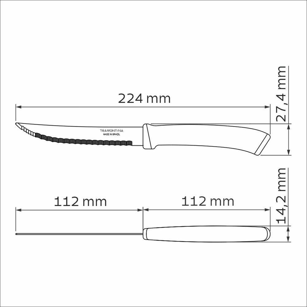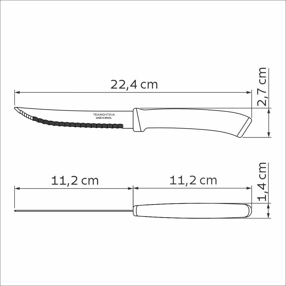 Faca Para Churrasco Tramontina Felice Aço Inox Fio Microsserrilhado Azul 5 TramontinaFaca para Churrasco Tramontina Felice Aço Inox Fio Microsserrilhado Azul 5 Tramontina -Faca para Churrasco Tramontina Felice Aço Inox Fio Microsserrilhado Azul 5Corte suas carnes de churrasco com facilidade utilizando a faca para churrasco Tramontina Felice com lâmina em aço inox com fio microsserrilhada e cabo de polipropileno azul de 5 polegadas. Sua lâmina microsserrilhada proporciona cortes precisos e suaves, ideais para carnes grelhadas e assadas. O cabo confortável garante firmeza ao cortar, e o design robusto oferece durabilidade. Além disso, a facilidade de limpeza, podendo ser lavada na máquina de lavar louça, tornando um item essencial para o seu churrasco.Lâminas de aço inox com maior durabilidade do fio devido ao tratamento térmico. Cabos de polipropileno com maior resistência e durabilidade. Podem ir à máquina de lavar louças facilitando seu dia a dia.Cuidados com o produto Antes da primeira utilização, lave bem as peças e seque-as. Produtos cortantes e perfurantes: tenha cuidado ao manusear e mantenha fora do alcance das crianças. Para maior durabilidade dos produtos recomenda-se secar bem antes de guardar, mesmo após lavagem em máquina. Recomenda-se o uso de tábuas de polipropileno ou madeira da Tramontina para maior durabilidade do fio das facas. Não é indicado o uso das facas para o corte de alimentos congelados. Para descarte dos produtos e embalagem siga as orientações de reciclagem vigentes.Garantia90 dias para vícios ou defeitos de fabricação. - -Características Gerais do Produto:Garantia: - 3 Meses