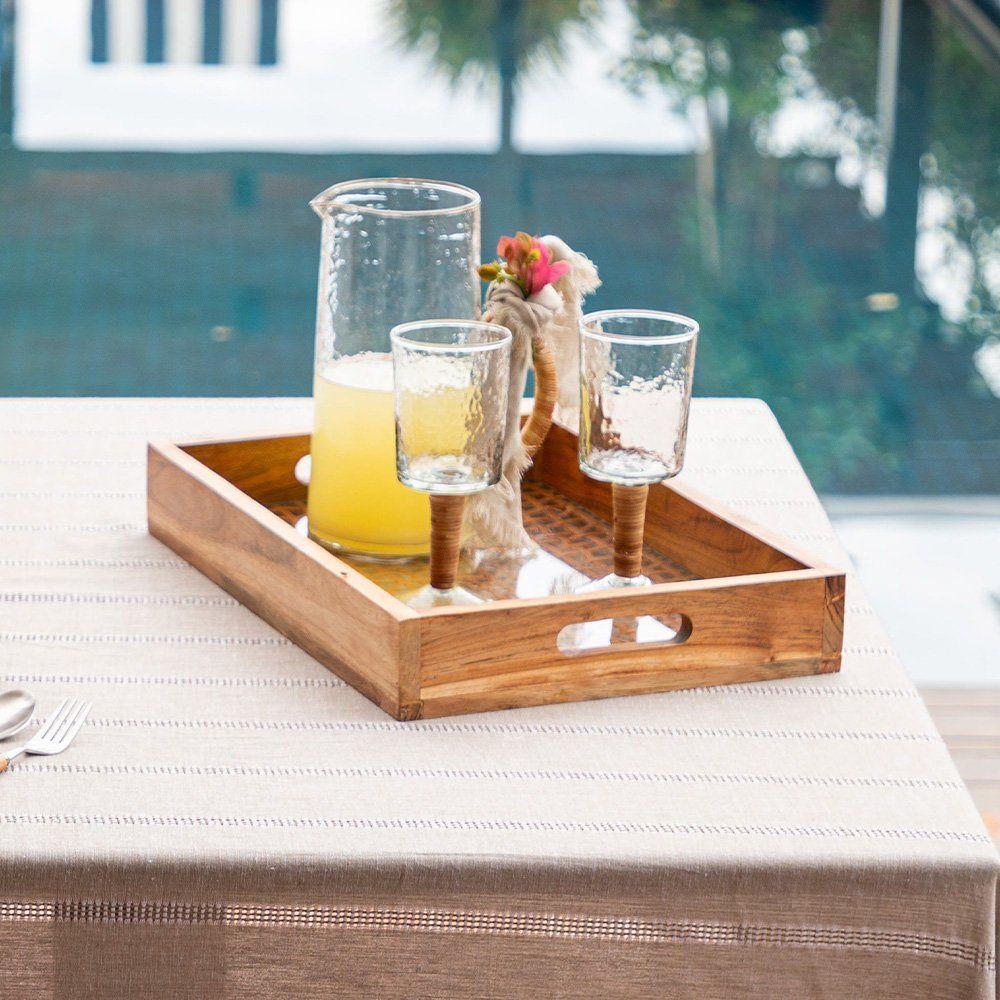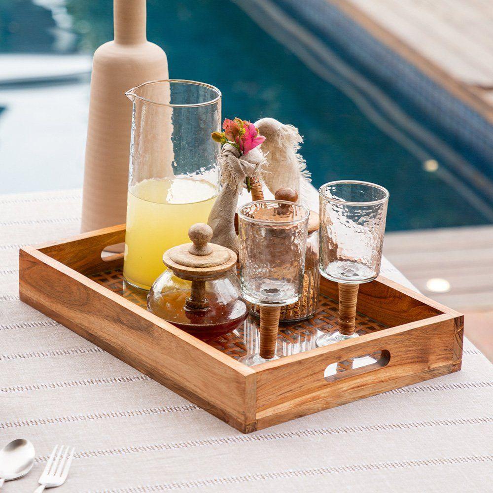 Bandeja Copa E Cia Trancoso RetangularBandeja Copa e Cia Trancoso Retangular -Características Gerais do Produto: - Composição: Madeira; Vidro; Cana - Detalhes: Fabricado na Índia.; Peça Vendida de Forma Individual.; Design Exclusivo Copa&Cia.; As cores podem sofrer pequenas alterações de cor, variando de monitor para monitor.; Os objetos que ambientam as fotos não acompanham o produto.; As fotos produzidas são apenas como sugestão de uso com as demais peças da coleção.; Peças 100% artesanais. Podem ocorrer variações entre cada unidade. - Cuidados: Armazenar em local seco e arejado.; Limpar o Produto Apenas com Pano Levemente Umedecido; Evitar contato com objetos cortantes ou superaquecidos.; Não molhar; Não utilizar solventes, abrasivos ou alvejantes.; Evite choques-térmicos e impactos. - Dimensões (cm): Largura: 30 cm; Comprimento: 43 cm; Altura: 6 cmAcompanha o produto: - 1 Peça de Bandeja Garantia: - 7 dias/30 dias contra defeito de fabricação